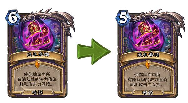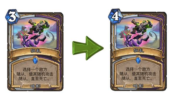 开发者评论:3点法力值消耗的狂乱根本没有给对手留下考虑应对方式的机会。将狂乱的法力值消耗提升至4点就能为控场决策留出空间,还让牧师/术士套牌中的廉价解场手段有了更明显的用途。