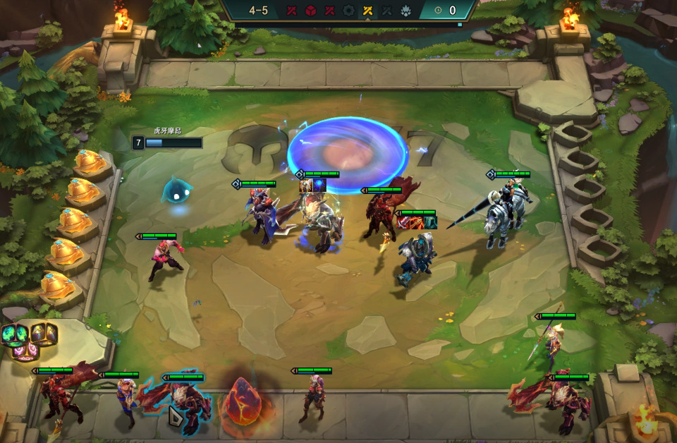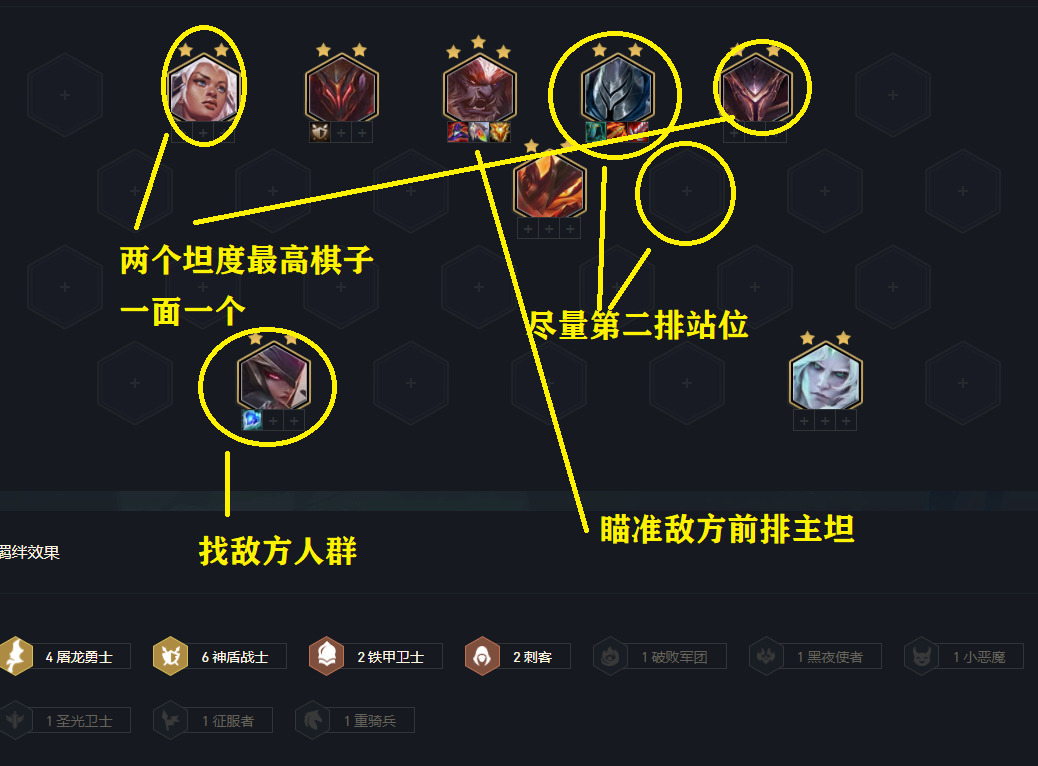 第一排棋子:前排棋子一字排开,芮尔,潘森一面一个,巨魔找敌方主坦,如果有鸟盾武器可第一排站位,如果没用尽量不要站第一排,避免被薇恩飓风刮到,或者站位在薇恩的另一面。
