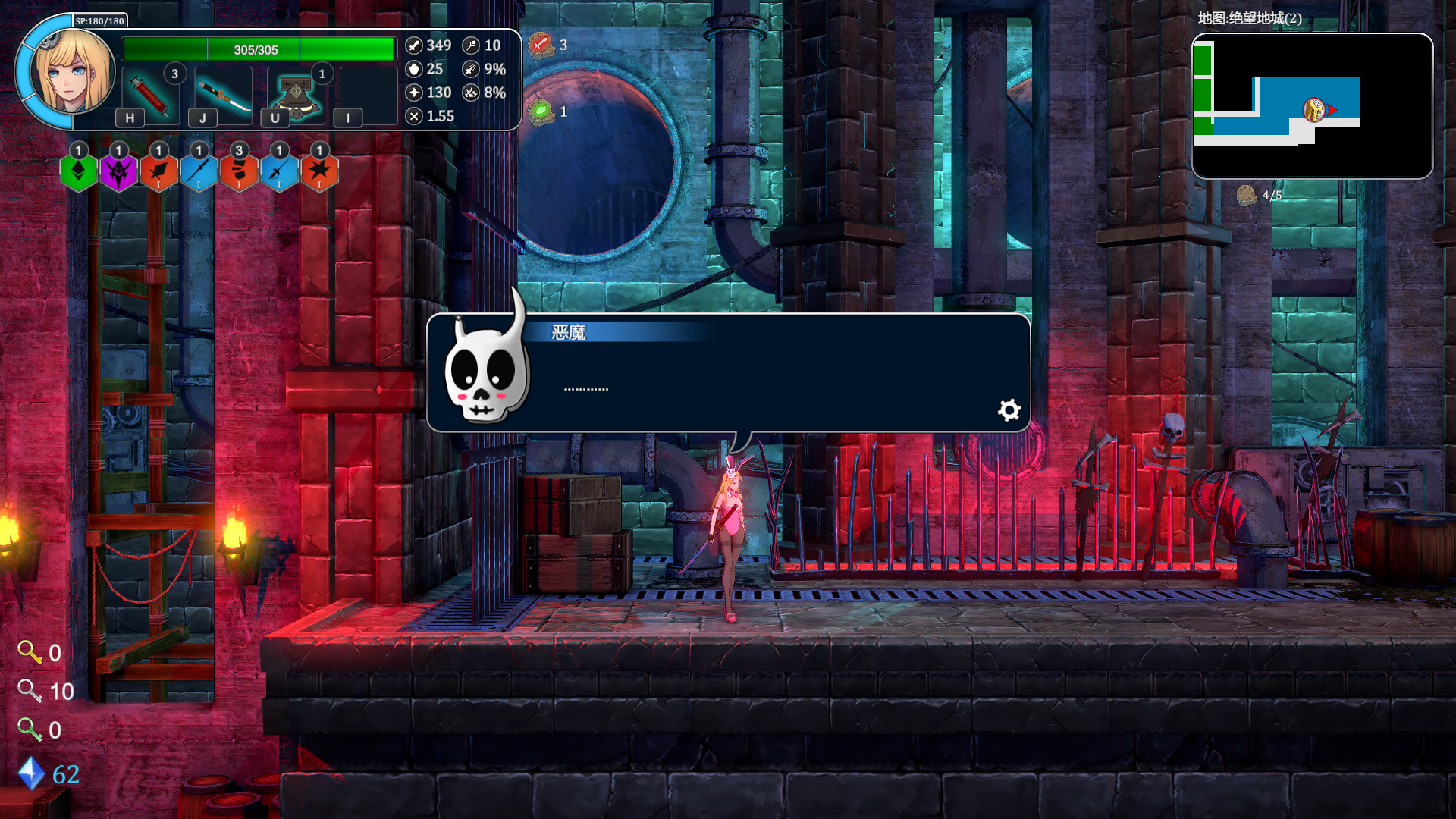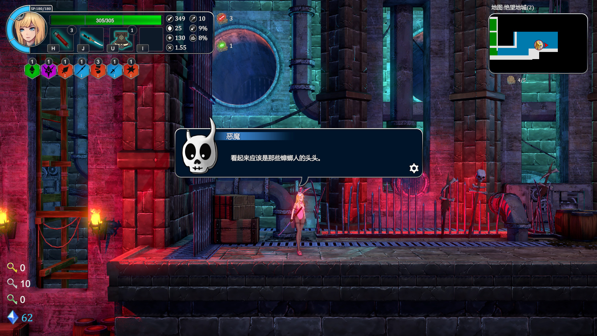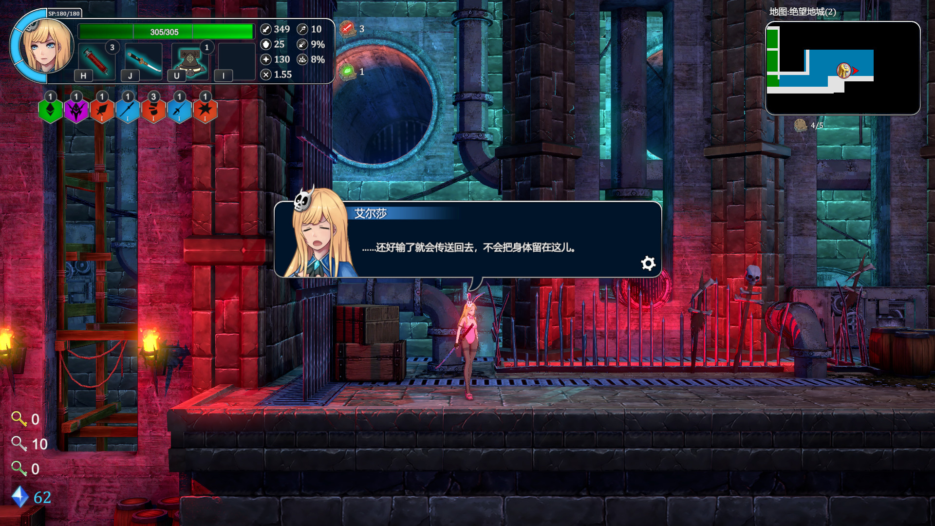根据官方的介绍,这是一款综合了Roguelike+类银河战士恶魔城+日本动画的游戏,玩家将在随机模块组合而成的巨塔世界中不停的向上进发,巨塔中拥有各种不同的地理环境,探索与挑战同在。由于主角Erza和魔王的契约,每当Erza死亡的时候都能被魔王使用时空魔法传送回最初设置的地点,在不断的轮回中,弱小的Erza将变得越来越强大,越来越接近挑战的目标。