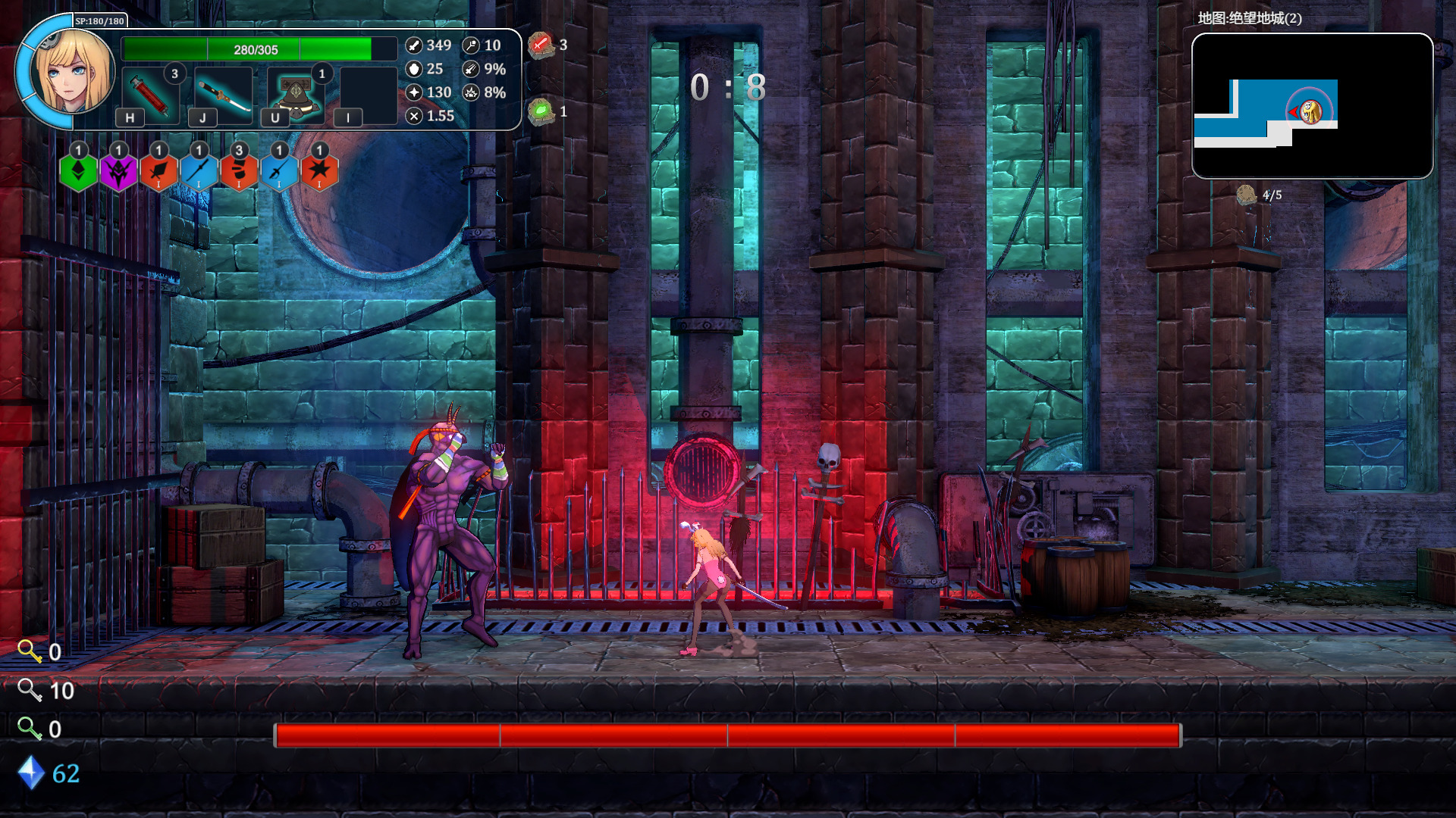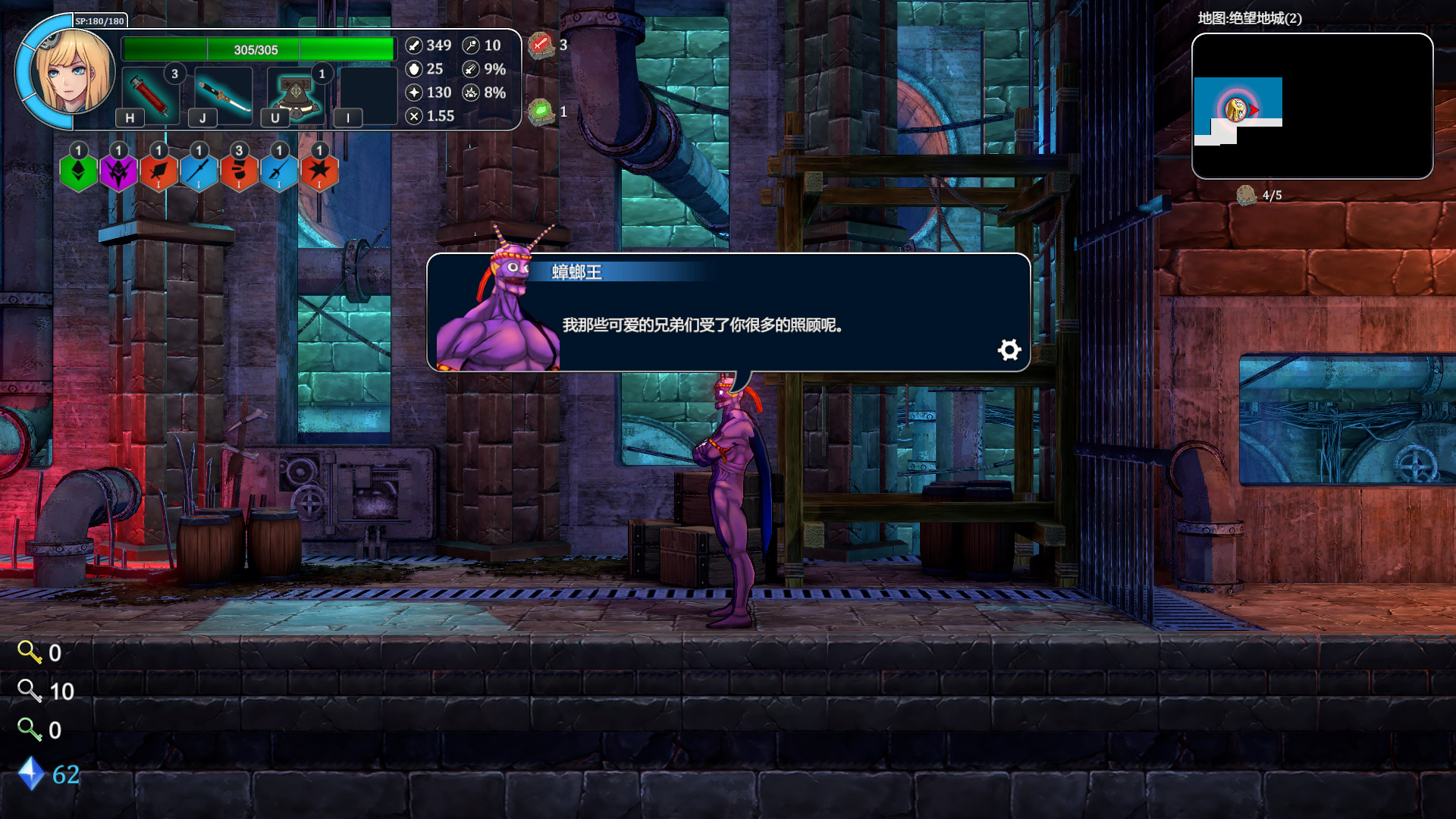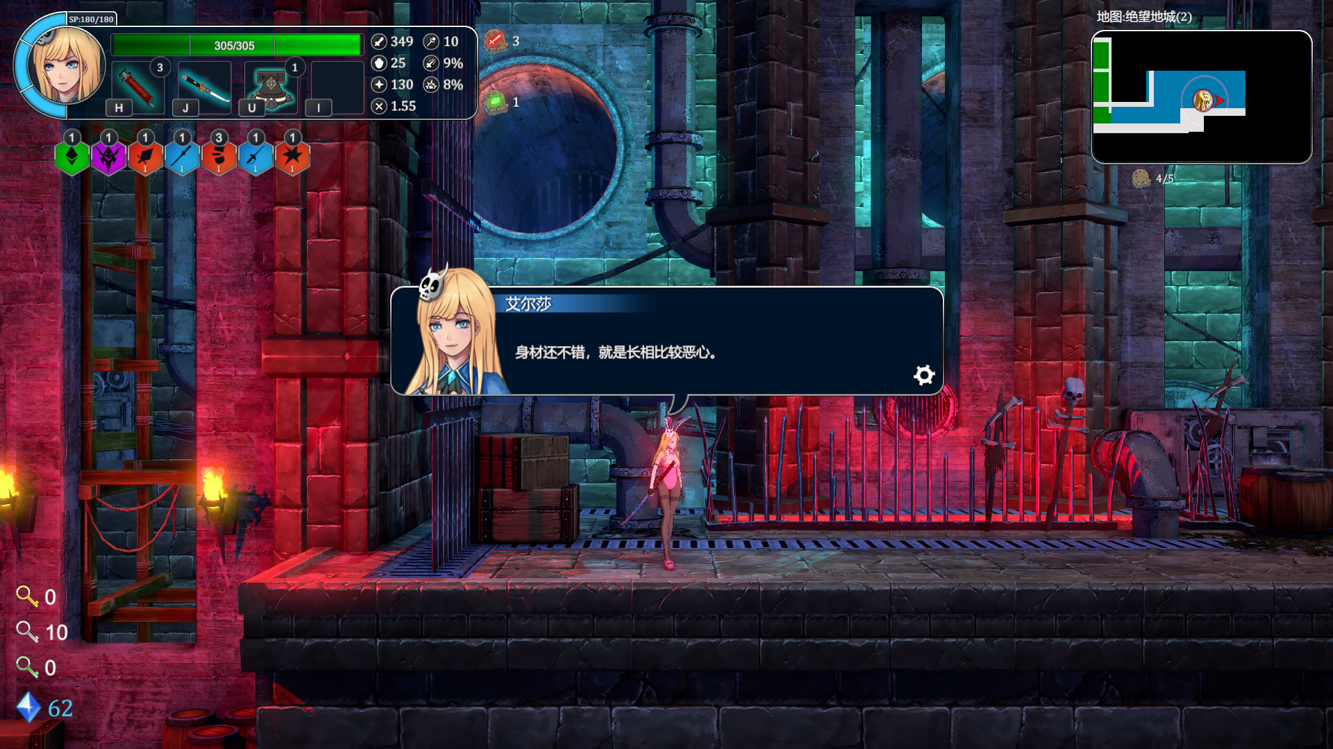 根据官方的介绍,这是一款综合了Roguelike+类银河战士恶魔城+日本动画的游戏,玩家将在随机模块组合而成的巨塔世界中不停的向上进发,巨塔中拥有各种不同的地理环境,探索与挑战同在。由于主角Erza和魔王的契约,每当Erza死亡的时候都能被魔王使用时空魔法传送回最初设置的地点,在不断的轮回中,弱小的Erza将变得越来越强大,越来越接近挑战的目标。