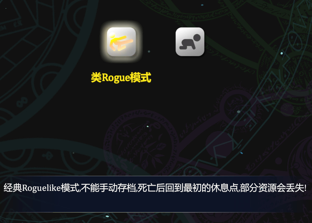 类肉鸽模式,无法存档,死亡自动回到游戏初始点并损失部分资源。