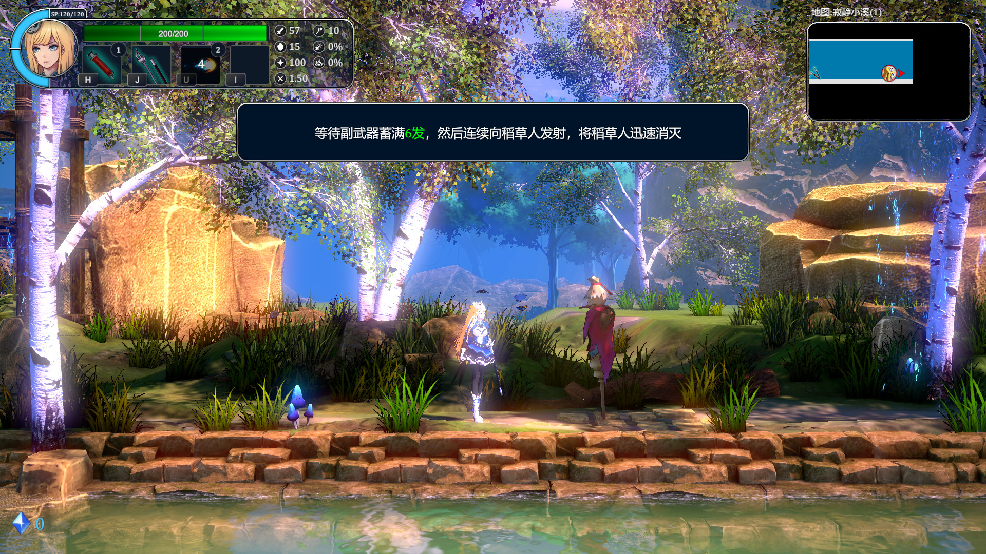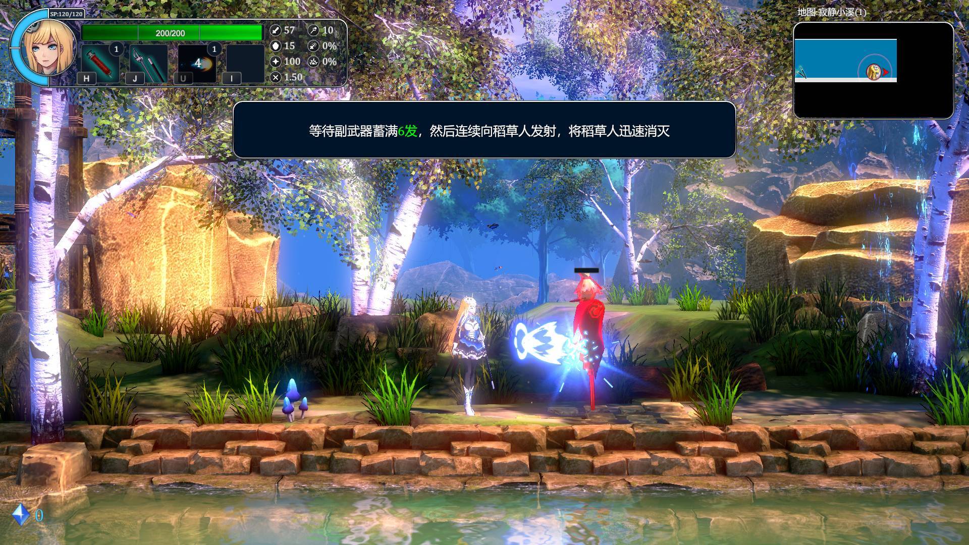 但是有一个比较搞的地方是走了几步之后进入副武器教程,教程是让玩家用副武器枪来打败稻草人,主要讲解系统是副武器的子弹是有限的,但会随时间自动填充,而搞人的地方,它让我蓄满六发打败稻草人,但是给我枪的时候一发都没有,填充一发大概要五秒,于是我就站在那儿等了半分钟。