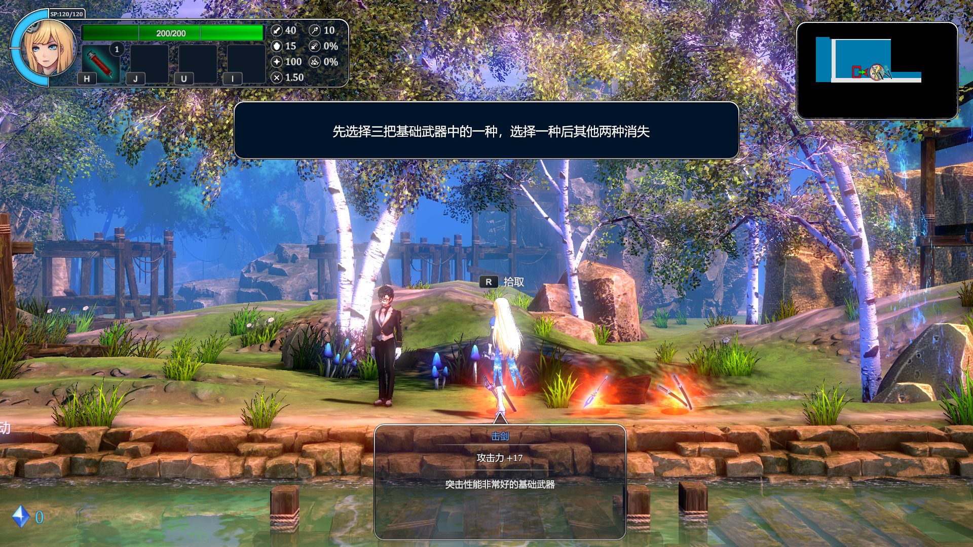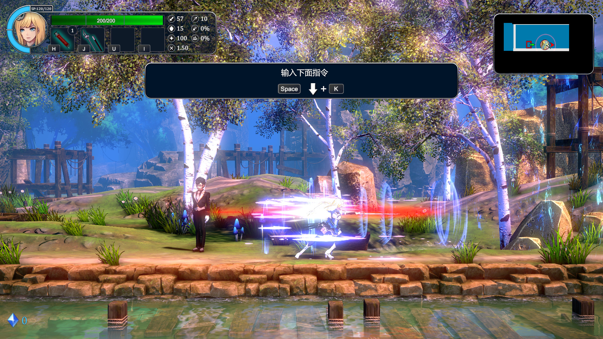 一开始有新手教程,具体动作这里我们就全跳过了。总之就是攻击分轻重,派生非常多,JJJ,JJKKK,JJKKJK,↓→J,空格K,手感非常不错,说明制作组在动作这方面还是很用心的。