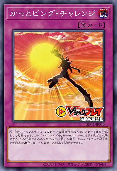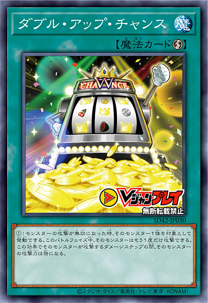 怪兽的攻击无效时,选择那1只怪兽才能发动。这次战斗阶段中,选择的怪兽只再1次可以攻击。那个场合,选择的怪兽在伤害步骤内攻击力变成2倍。