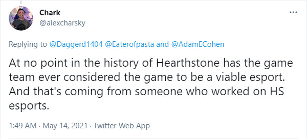 【前两天因为万智电竞向衰的事,前炉石电竞赛事经理Alex Charsky也冒泡抛出一句内幕,说“炉石的游戏开发团队从未想过做电竞”,引人纷纷围观吃瓜,但其实也没什么新瓜可吃,懂的人都懂。Iksar当时回了个他的招牌表情(已阅/留名),今天自然要被问这个问题】