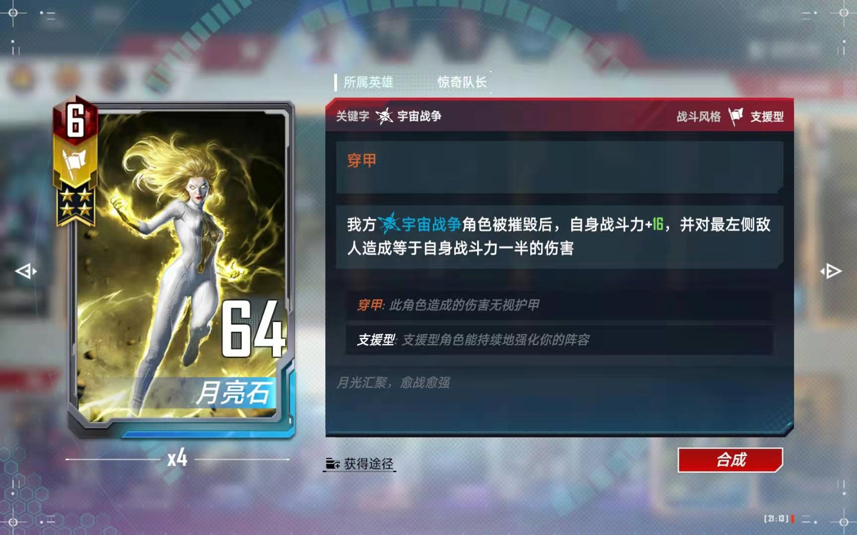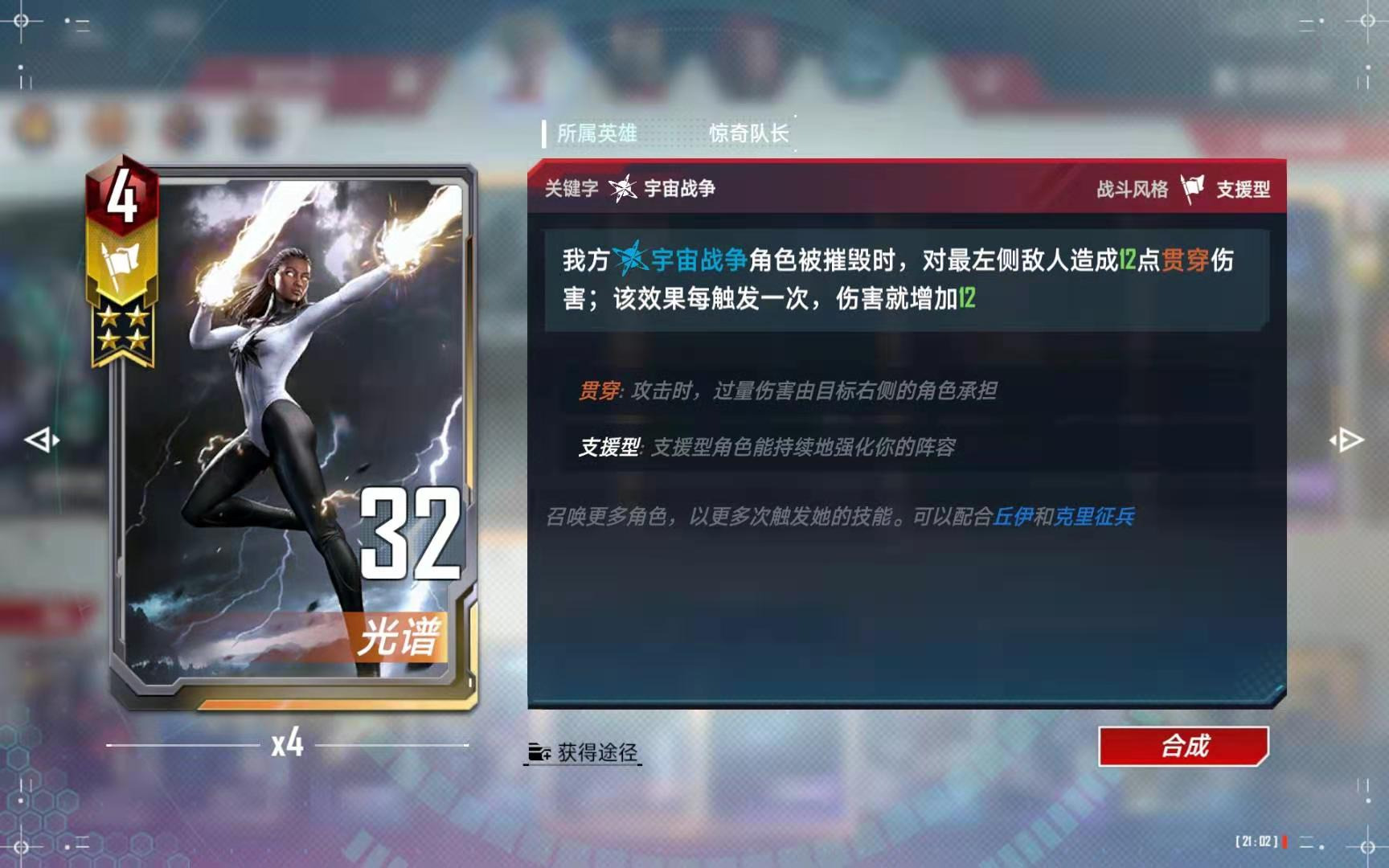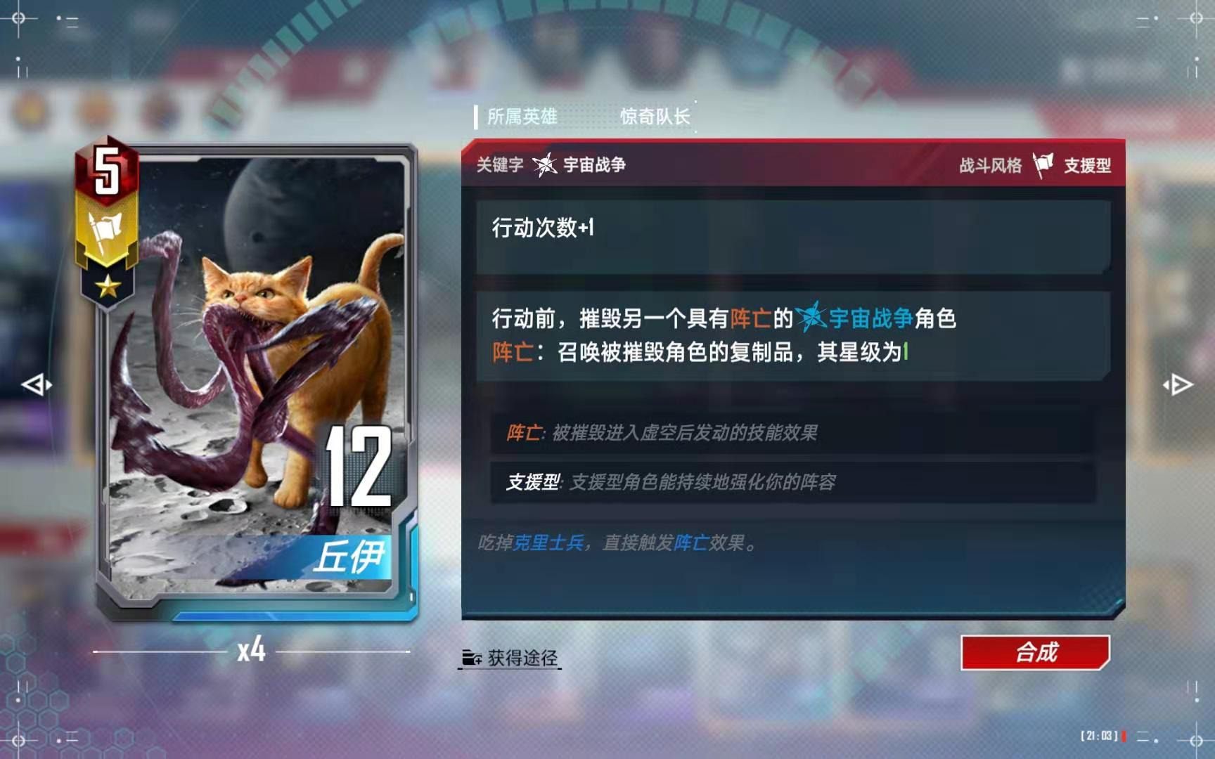 2、惊奇力量:主动:选择一个1星的“宇宙战争”角色+1星级。只能使用一次。