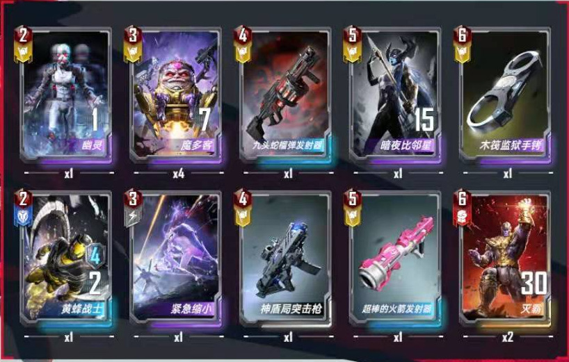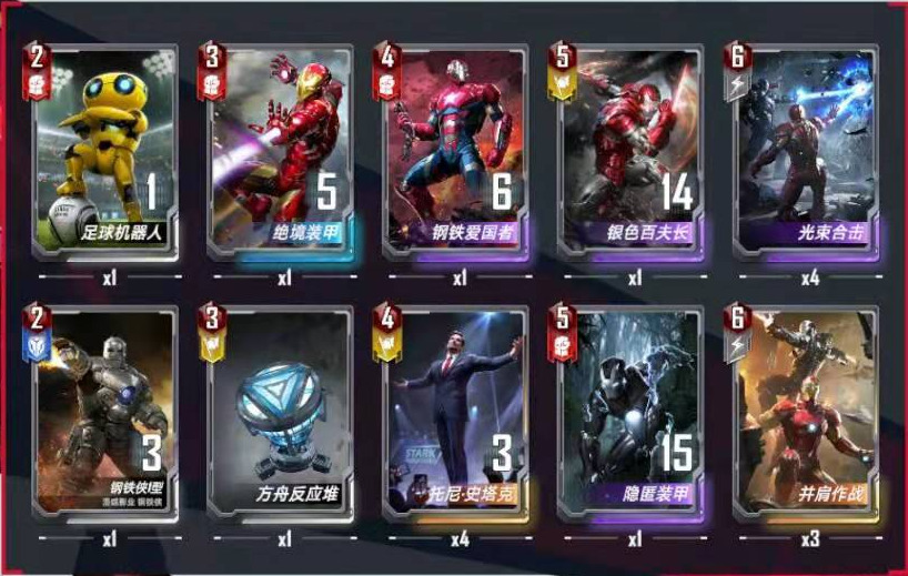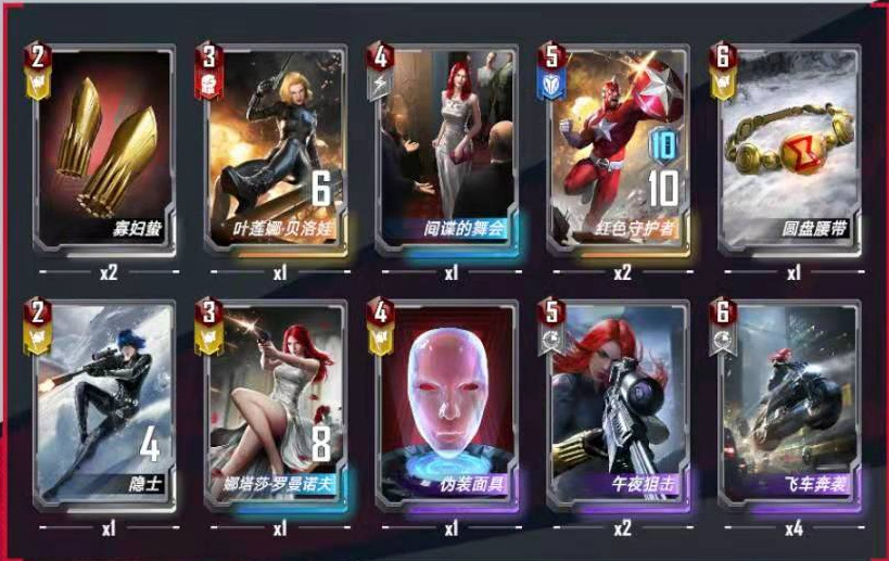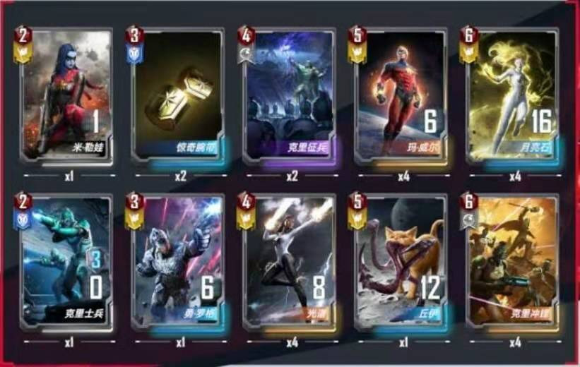 上了五本以后,利用猫带上抢钱枪(超棒的火箭发射器)不停的吃克里士兵,从而触发佩戴了寡妇蛰的穿甲光谱的伤害。从而达到穿甲击杀敌方全队的效果。另外玛威尔可以将全队宇宙战争的伤害转为自身的血量,非常之强大。为了让对手大概率攻击召唤出来的克里士兵,本卡组使用“红色守护者”来隐匿其他惊队单位。