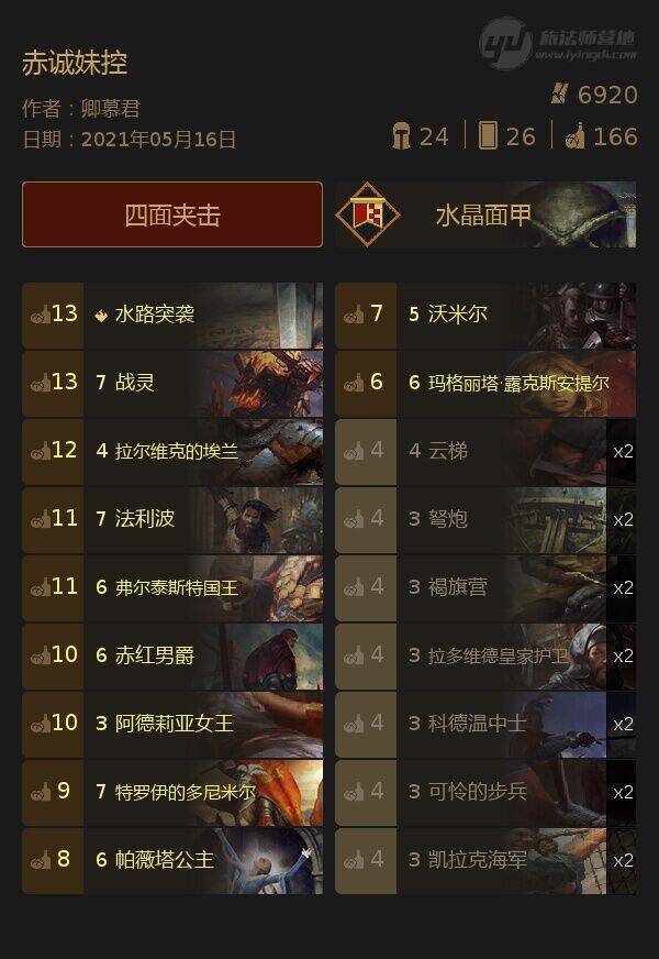3.在逼牌或者被逼牌时,手牌有还未第一次使用的解梦或水陆时,打光是不错的选择,甚至就算解梦水陆使用过一次依然可以打出,因为牌组中大量的蓝衣铁卫突击队很容易被摸到;