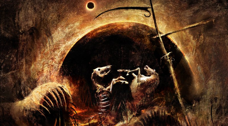然而神日打开了来世之门,永生者军队带来的只有毁灭。生与死、诺言与欺骗、希望与绝望,种种对立完美地诠释了黑白色组的冲突,插画上波拉斯的双角也提醒着我们阿芒凯发生的悲剧。更讽刺的是,波拉斯自诩为神,而这张牌的名字却是无神祭祠。