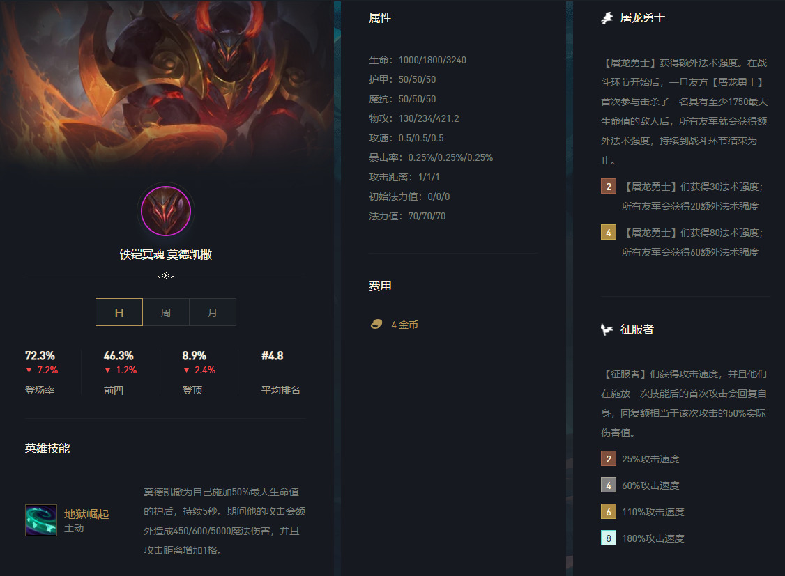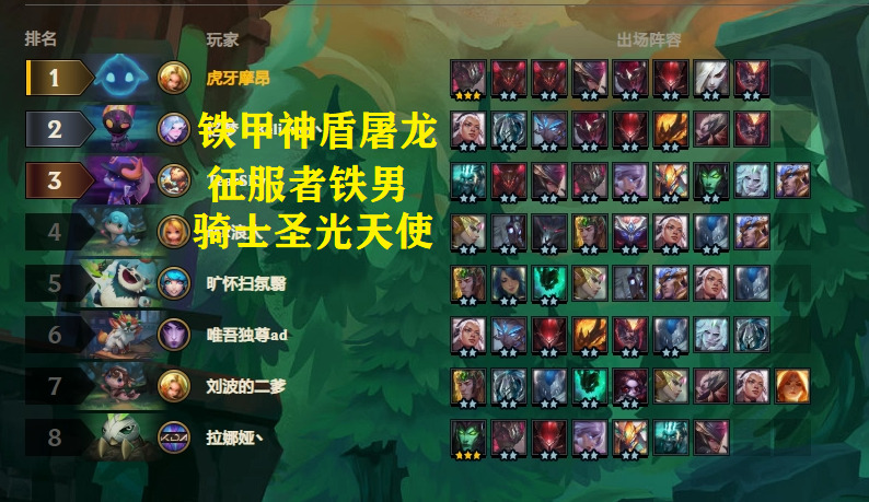 3-2左右拉6人口,这时候可适当D卡,阵容开始向黑夜屠龙转换,添加3神盾羁绊,但这时候注意屠龙羁绊只是给屠龙棋子增加法强,很难触发全员增加法强的收益(棋子血量很少超过1750)。