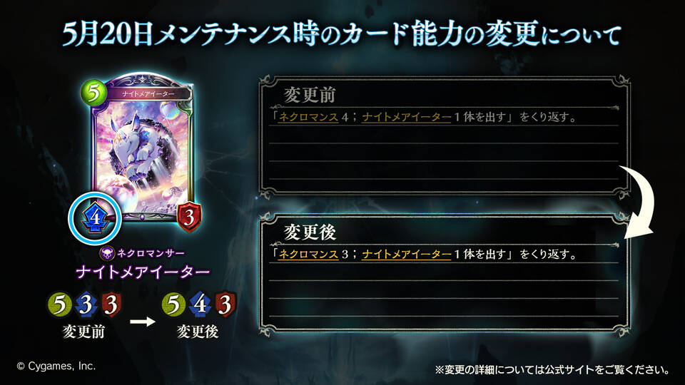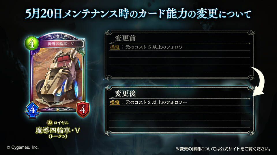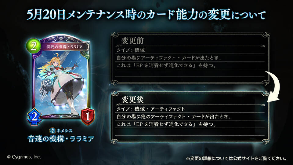 19日中午,Cygames公布了即将于20日更新中实装的平衡性调整,决定加强三张传说卡牌,分别是魔导四轮车·V(幻影拍档·巴妮与巴隆的token)、噬梦貘以及音速机械·洛菈米亚。