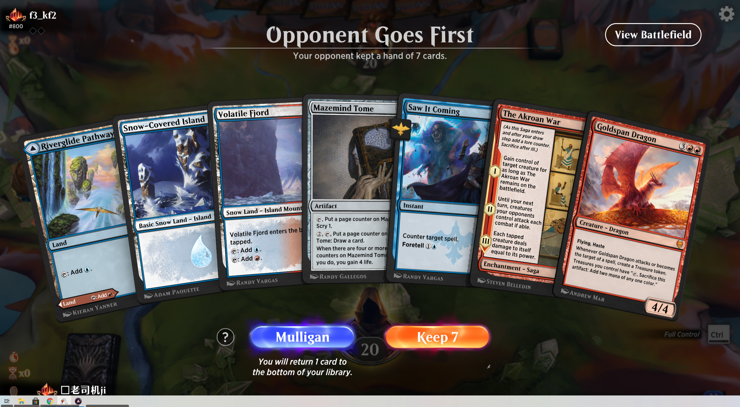 还是一个非常蛋疼的起手,只有两张地,一张红色一张无色。考虑到最坏情况2回合可以预示早知于此,预示后只需要一点蓝。我有三次抓牌机会拿到一张地,只需要多一张地就可以准时使用手上两张地的顶级曲线生物三回合可以给对方制造威胁,即使不能抓到或者不能连续抓到也可以用两张巨人处理多余法术力。因为对手是红蓝节奏,最快也要5回合才有值得反击的生物,我有4次抓牌机会拿一张蓝地,我觉得不算很难。最坏情况拿不到蓝地,我也有一个红帽客搏杀留给虚假的长老龙和真正的长老龙,不会处理不了。最后考虑到核心组件已经到手,就决定接下来。