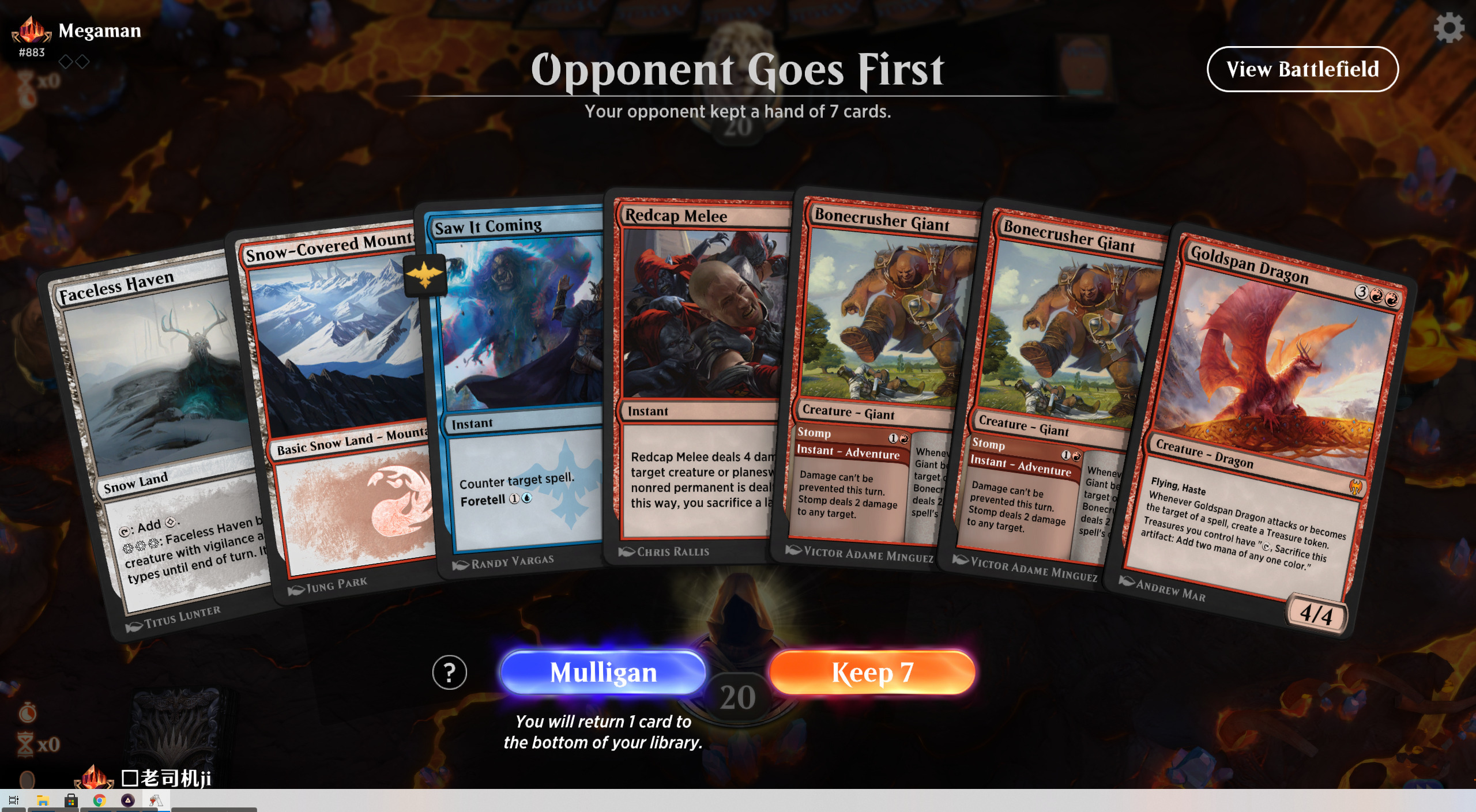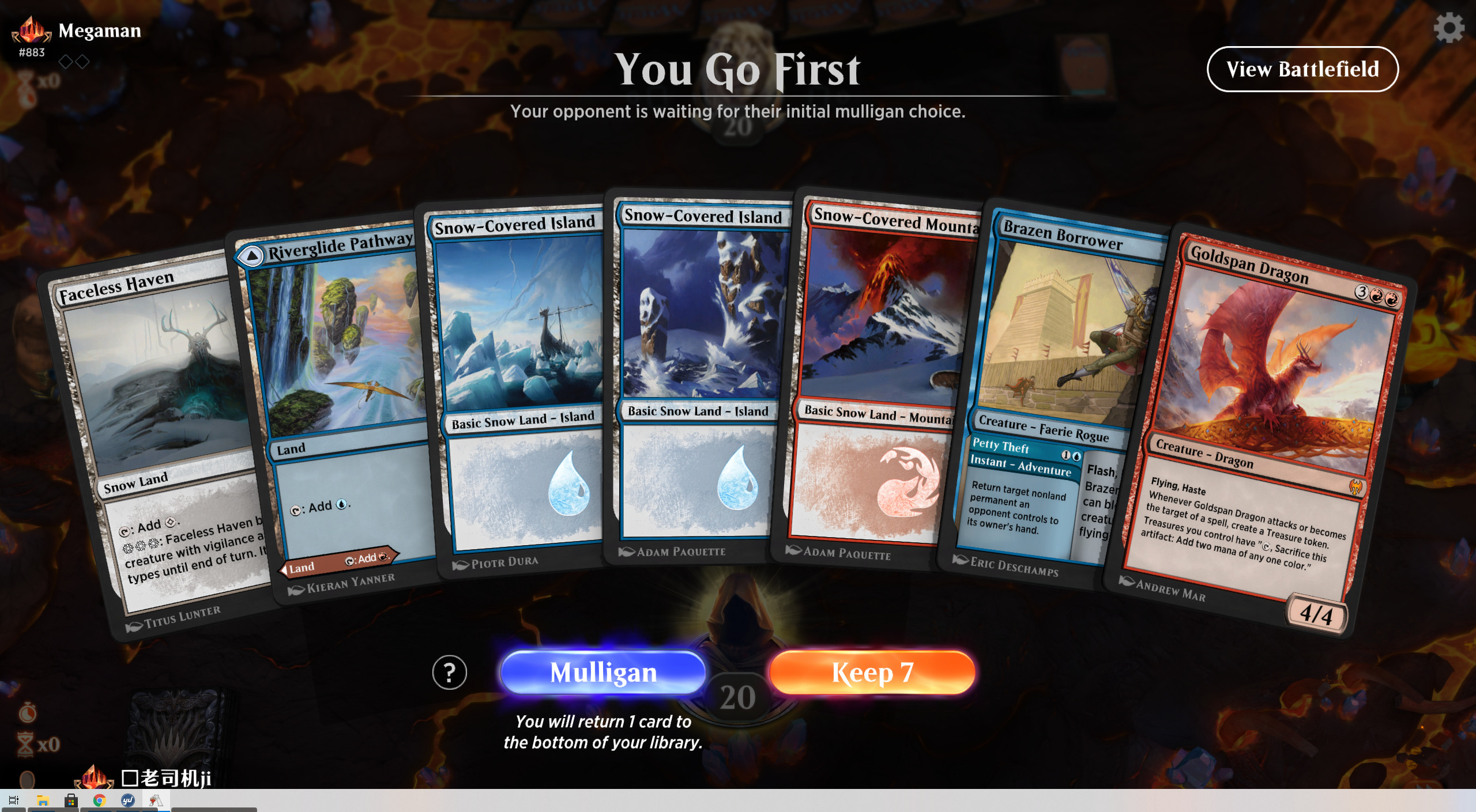 这是个非常蛋疼的起手,5张地实在是太多了,但考虑到后手可以抽多一次牌,小偷小摸可以拖一回合节奏,最坏情况下可以用无面者庇护地交换一个生物,核心组件已经上手,就勉强接下来。