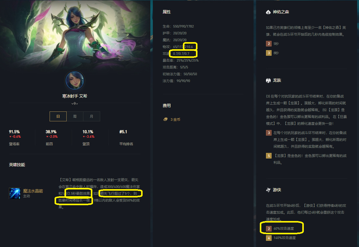 阵容中艾希是主要输出,主要利用就是利用龙族孵蛋快速达到3星艾希,3星艾希普攻伤害210,且技能群体控制,最长技能控制时间达到5秒(5格以上),但我们大部分时候不是利用其技能更多是需求其高攻击力与高攻速(出装纯攻速流),快速清理敌方。