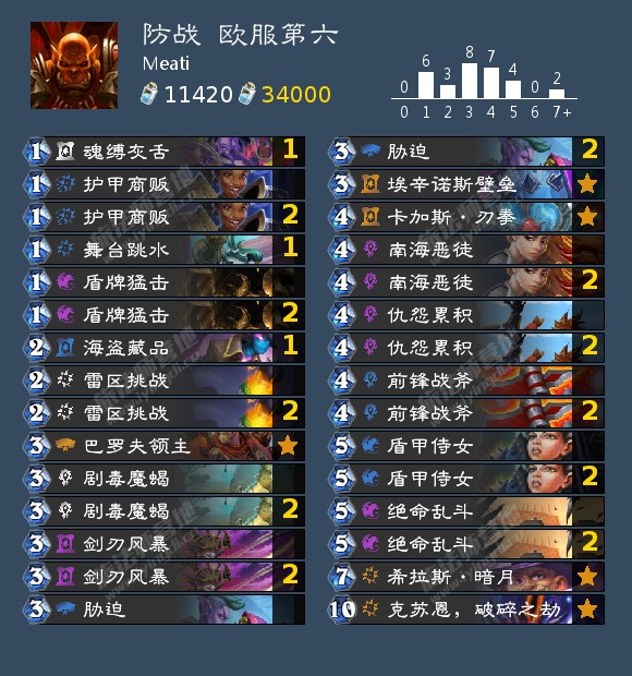 补丁后似乎又能玩的防战则存在着一个比较大的问题——不能同时抓环境的两头。如果要抓进攻卡组,那就要带薄,剑盾猛攻啥的统统安排上,然后碰见一个牧师,无了;要打控制卡组,那就得带上大哥,或者是像Meati这样带上一套终结体系,然后碰见一个奥秘骑,无了。这其实是卡组构筑的常见问题之一了,从历史上来看……几乎是无解的。