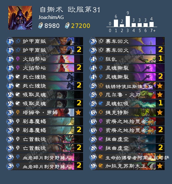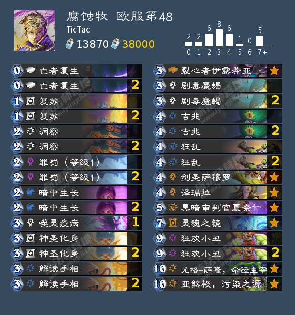 虽然本周我没有看到前百玩家po法术法的卡组,但是据我所知法术法还是有不少拥趸的,毕竟它有着颇高的上限以及稳定的基本盘。事实上,对于天梯排名稍微靠前的玩家来说,盲开天梯的最好选择可能就是法术法了。至于卡组的话……大家不妨移步上一期盘点。