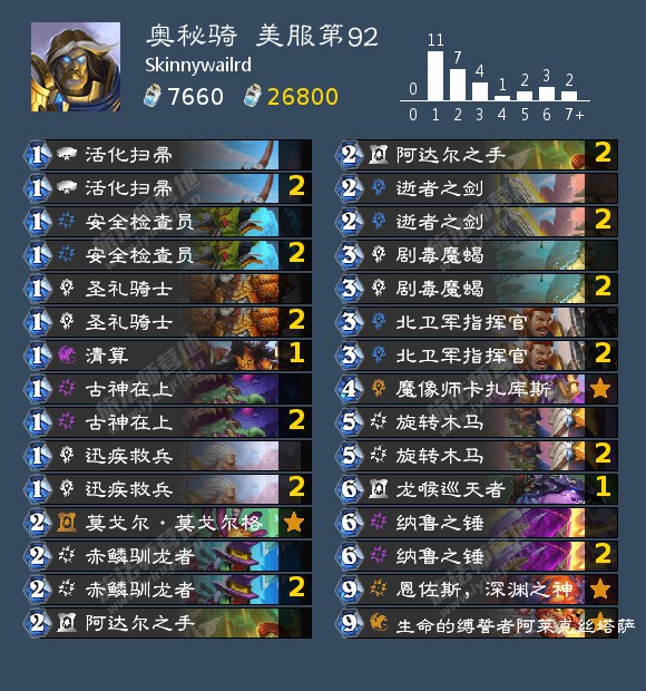 在螃蟹骑士和新生入学大削之后,快攻骑变得几乎不可玩了,目前常见的奥秘骑卡组往往会选择携带恩佐斯体系,并携带大量扎实的中期随从,进而将强势期整体后移、争取在中后期做到给足压力。构筑细节来说,我认为现在的奥秘骑不太能带六个奥秘,不然中后期快断牌的时候抽个奥秘······有点想直接退了。五奥秘应该是比较合理的选择,而腾出来的卡位可以给活化扫帚,进而给这套中期傻大个颇多的卡组以一定的返场能力。