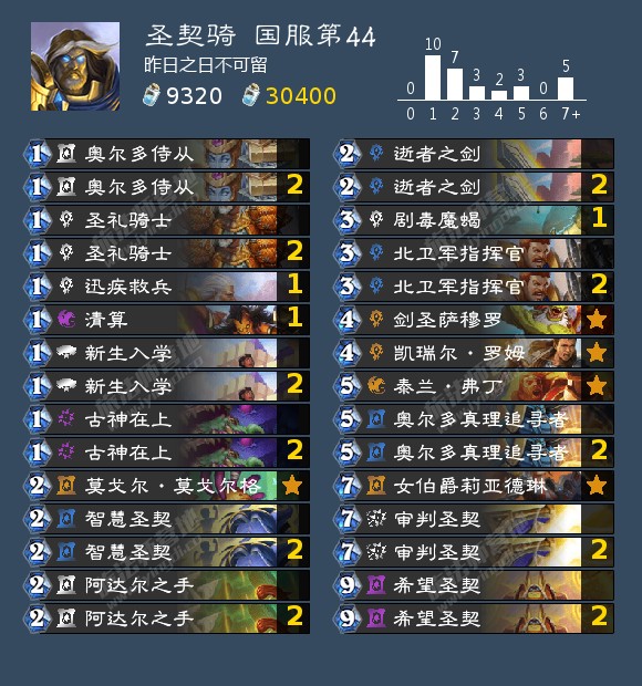圣契骑则是环境普遍降速的受益者。虽然铁喙猫头鹰、无名者、暗影猎手沃金和希拉斯·暗月都能起到一定的克制作用,但是对于跟沉默手段斗智斗勇了将近一年的圣契骑玩家来说,分散投资、少量投资都应该是基本功,倒也不太容易出现被沉默了就炸了的问题;在我看来圣契骑本身的强度最主要的制约因素还是它处理频率的能力实在是太弱了……而且由于卡位和环境问题,现在很多玩家又都会选择放弃正义圣契,这就导致在对上像红龙贼这样的对手时,这个问题被进一步放大了。不过作为一套天梯卡组,完全抛弃AOE也是不可取的,因此目前常见的圣契骑卡组都会带上剑圣萨穆罗,从而与各种buff配合,处理掉不那么过分的场面;除此之外,还带上了凯瑞尔·罗姆来抢节奏、争场面。