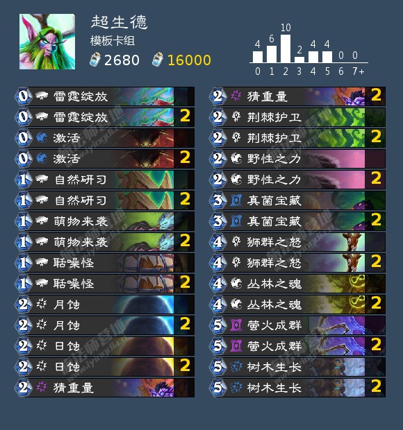 很多人都认为“15对”才是超生德的最优构筑,在我看来也是这样。灵魂指引、随心口袋这样的牌肯定不能说是不强,但是考虑到超生德目前的环境定位是“偷环境”卡组,这种“打变速”的单卡就势必没有狮群之怒、丛林之魂等打铺场的牌好用了。