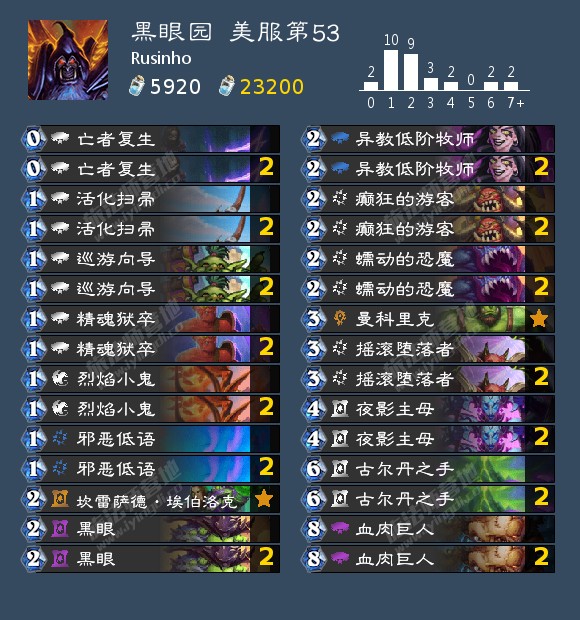 亡语瞎的构筑在本周也有革新,大家一般都会选择带上盛装演员、伦萨克大王等进行buff,从而增强站场或者是强化伤害。通过调度手牌,我们可以尽可能地让盛装演员的buff加在合理的随从上,进而打出效果。会出现这种构筑调整,主要是因为螃蟹骑士的削弱以及进攻卡组的式微。