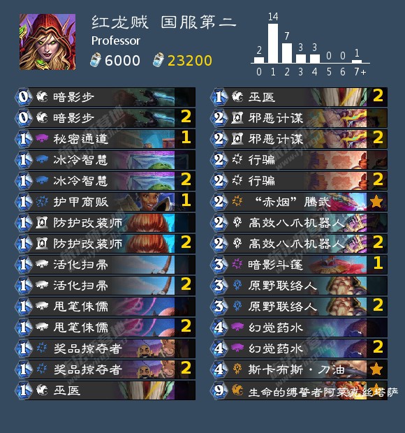 红龙贼的构筑已经稳定下来了,整个卡组框架沿用了Gaby的冠军体系,狐人老千以及梵妮莎·范克里夫成为了卡组的“最后拼图”。目前常见的构筑分歧在于携带单防护改装师加单甩笔侏儒还是满编防护改装师。前者解场能力更强、也不容易卡手,但是保护能力一般;后者则强在保护能力,毕竟套了盾的原野联络人很难解,也可以给任意随从套盾来增强交换能力,或者是干脆给厉害的怪套个盾,把对手推了。如果有评论区的话,我是一定要让大家聊一聊的,可惜……
