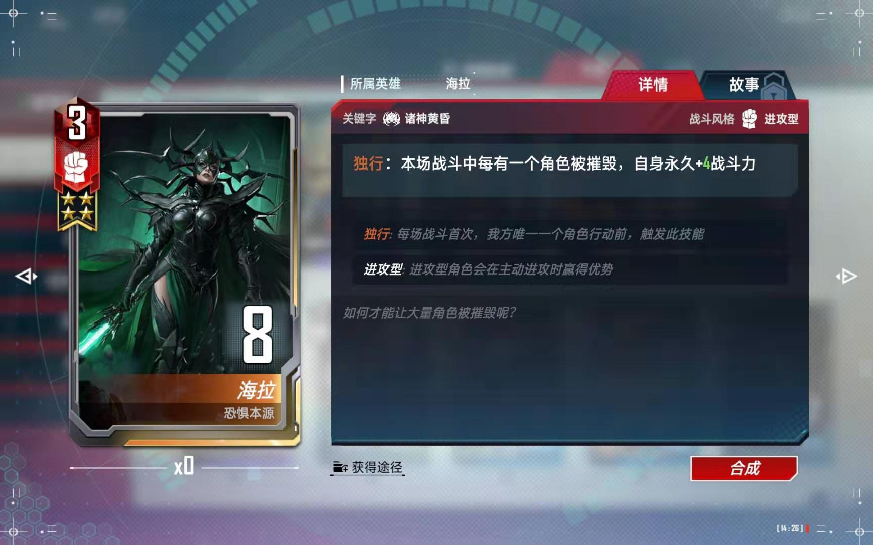 (9)海拉(恐惧本源):独行,本场战斗中每有一个角色被摧毁,自身永久+4战斗力(四星);