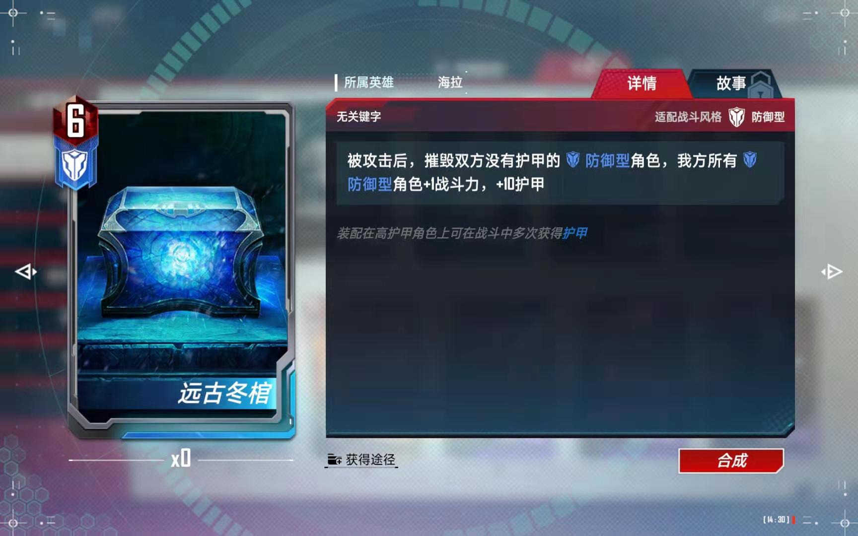 (10)远古冬棺:被攻击后,摧毁双方“没有护甲的防御型角色”,我方所有防御型角色+1战斗力、+10护甲;