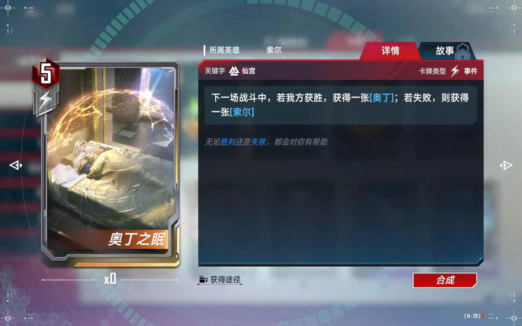 (4)奥丁之眠:下一场战斗中,若我方获胜,则获得一张“奥丁”,如果我方失败,则获得一张“索尔”;