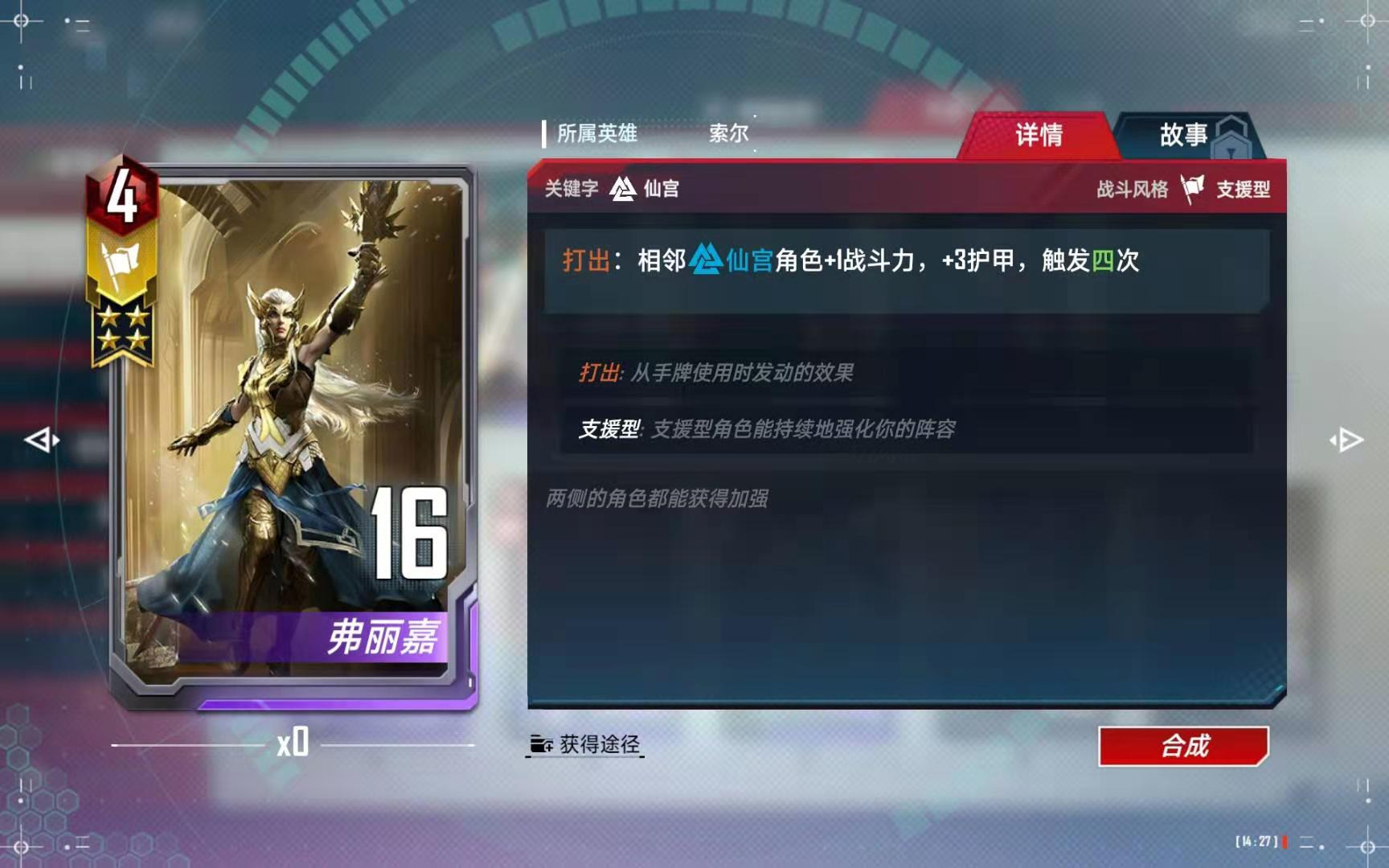 (5)弗丽嘉:打出:相邻的仙宫角色+1战斗力、+3护甲(触发四次)(四星);