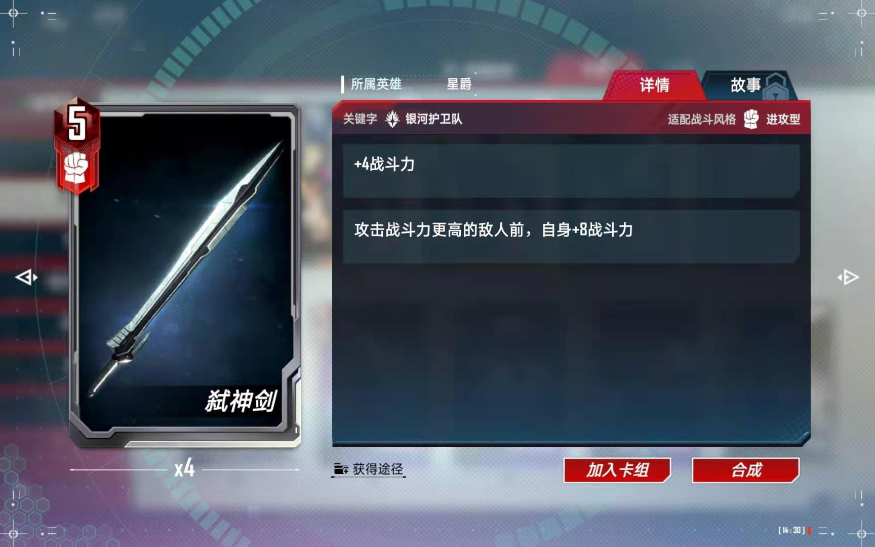 (5)弑神剑:+4战斗力,攻击战斗力更高的敌人之前,自身+6战斗力;