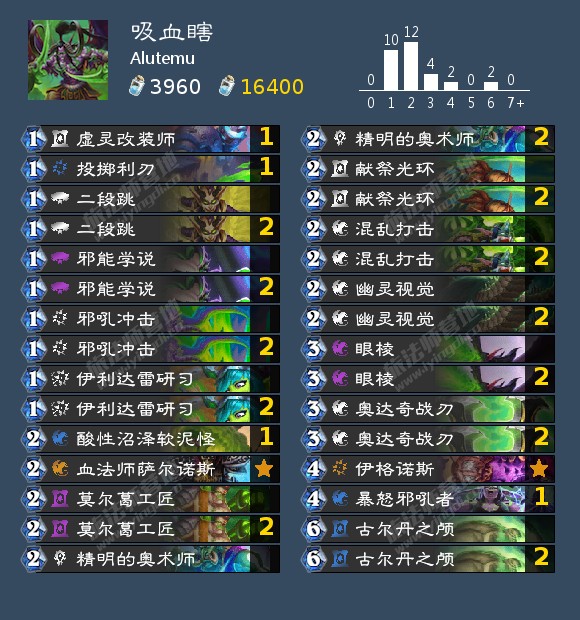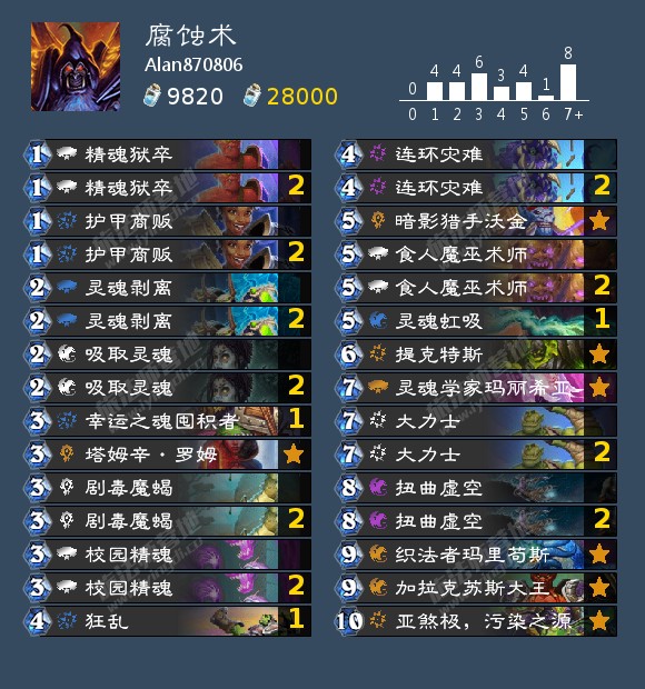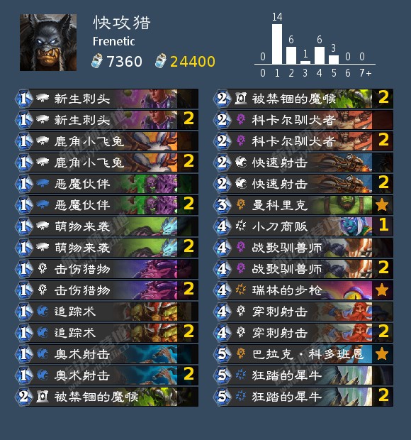 在GM中其他卡组上直播的样本较小,笔者就不一一列举了,比较有印象的是Leta的刀贼、Frenetic的猎人,都比较有构筑特色,还有就是Alan和Jarla的术士,在kof中作为狙击牧师的存在有时候也有意想不到的效果。