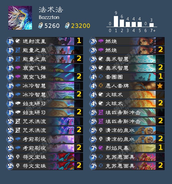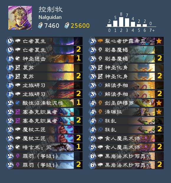 上周美服亚军Nalguidan的牧师卡组就考虑到了在kof赛制中被放出来的牧师所要面对的对局应该会包括刀贼和法术法,因而携带了针对刀贼的小软,食人魔巫术师在对面刀贼和法师的时候都是非常不错的牌,而比较少见地满编了黑岩法术抄写员也是考虑面对法师的时候这个随从非常不错。不过具体到对局,那就是另一个故事了: