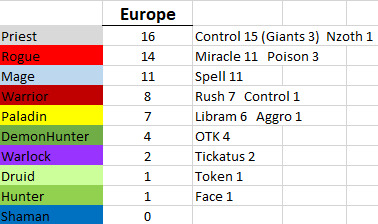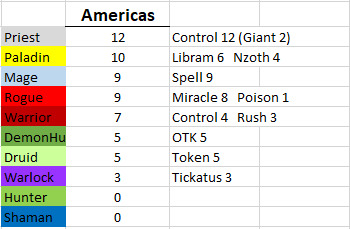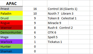 控制牧作为携带率最高的卡组几乎也吃到了上周所有的ban位,除了像Alan870806、jarla以及killinallday这样带了术士来counter牧师的选手和Che0nsu这样好像不知道牧师多厉害放了看上去组的很差的牧师然后被穿了的选手以外,似乎并没有太多选手想要在kof赛制中挑战牧师。不过即使如此,牧师还是贡献了少数精彩的对局。