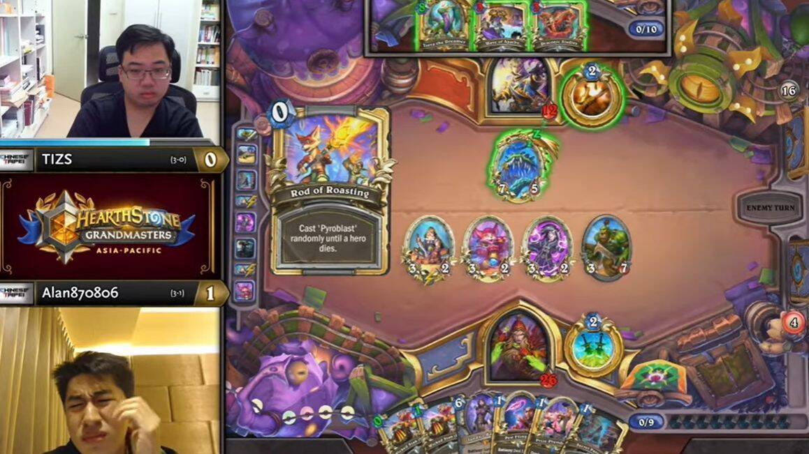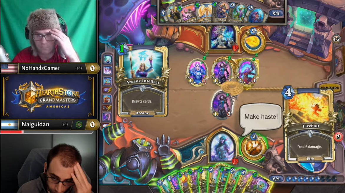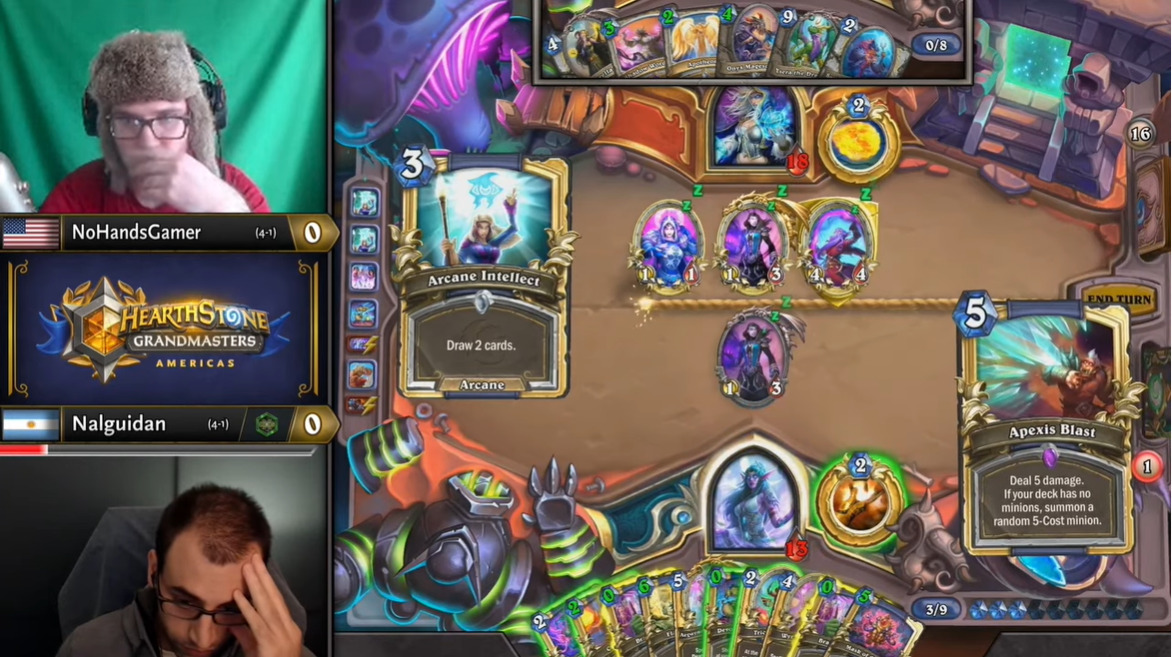 NoHandsGamer法术法洪流双凤凰刷夜开局,并在过了一堆牌之后打了第二个洪流,Nalguidan的牧师血量渐渐见底,在对手双衰变飞弹未交的情况下手牌几乎已经没有价值,但是裂心者的价值体现了出来。在Nalguidan打出裂心者之后,NoHandsGamer手中的过牌不仅为牧师回了费,而且还正好爆掉了牌库中的火球和埃匹希斯冲击,法师的直伤不够。这一回合的精彩操作最终帮助牧师一血翻盘。