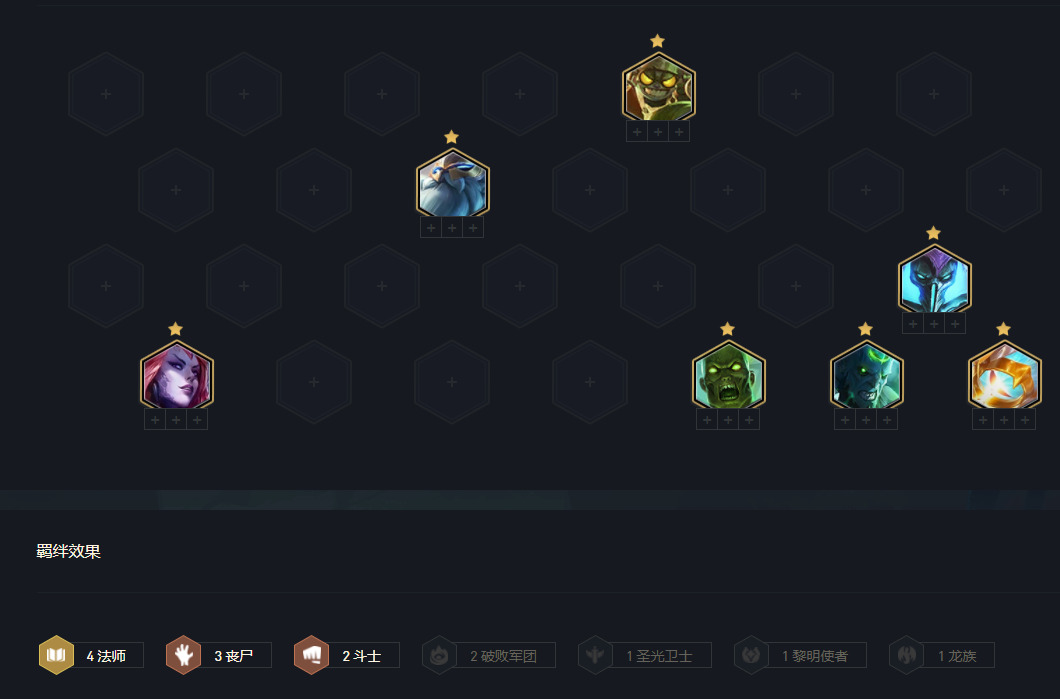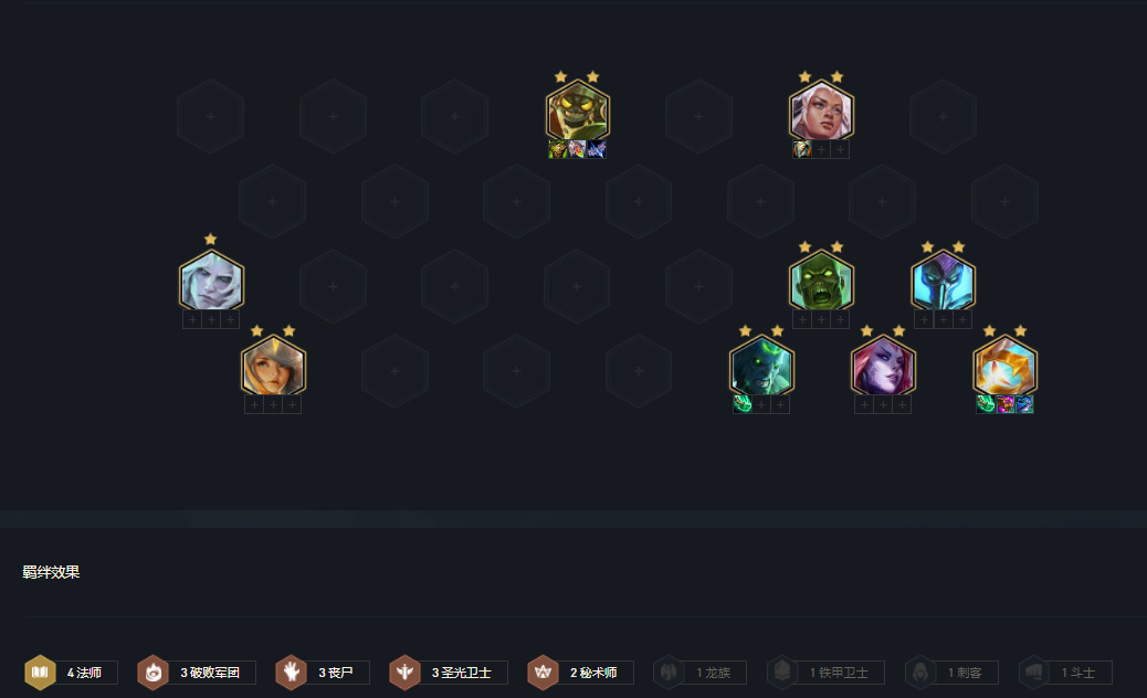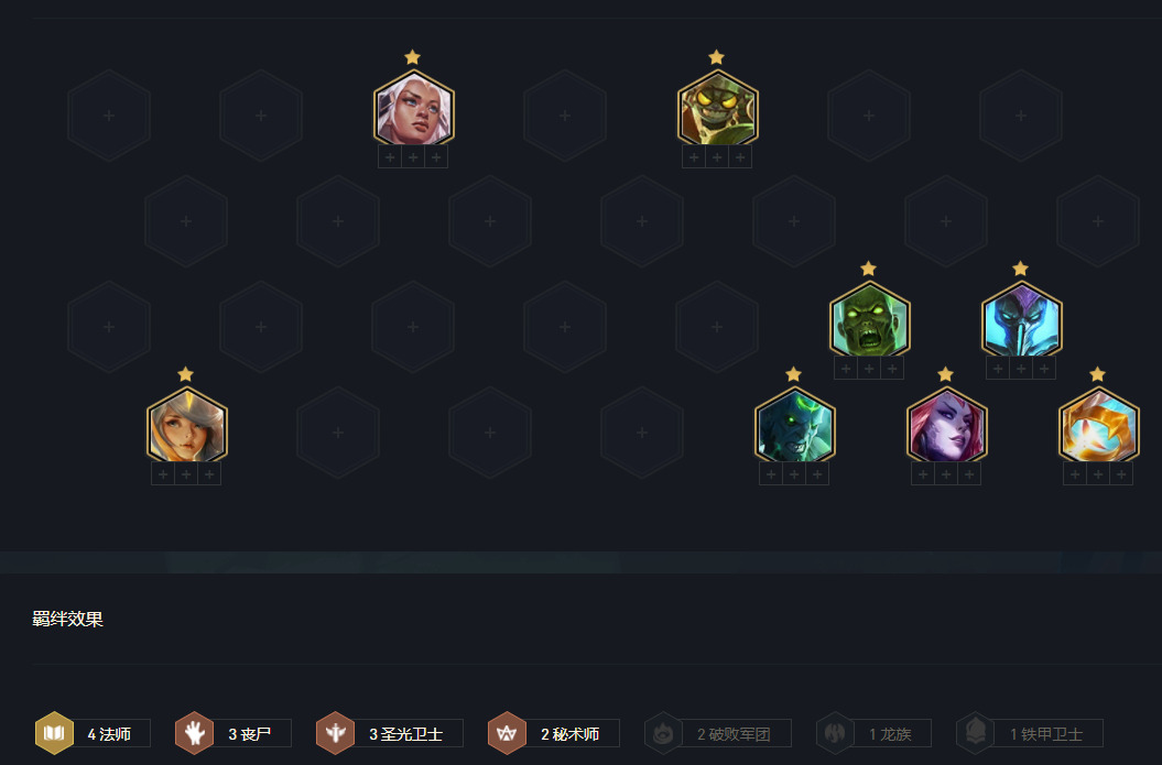 阵容运营关键羁绊:3丧尸+3圣光+4法。阵容主C大眼,副C努努、芮尔。