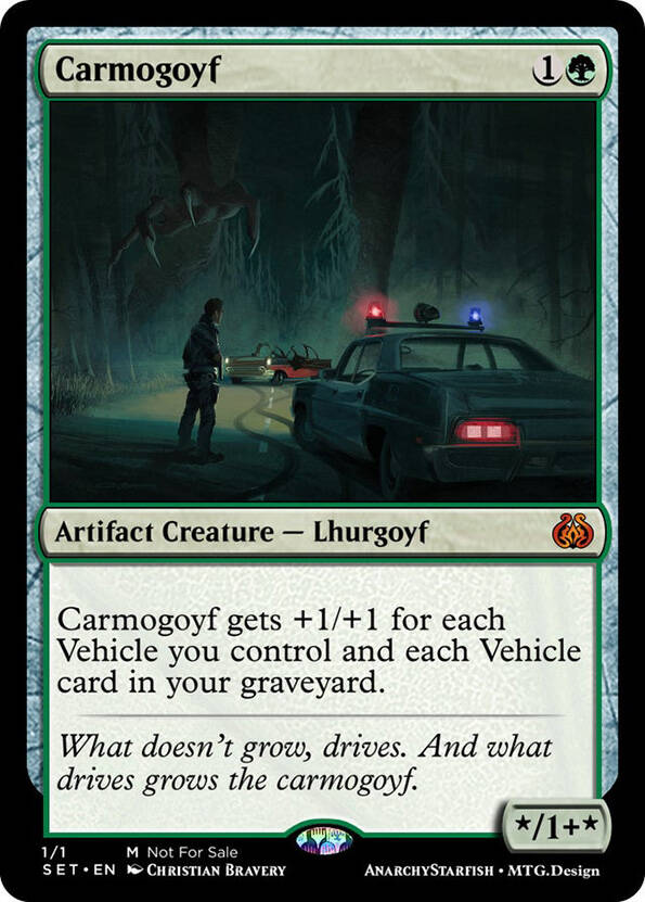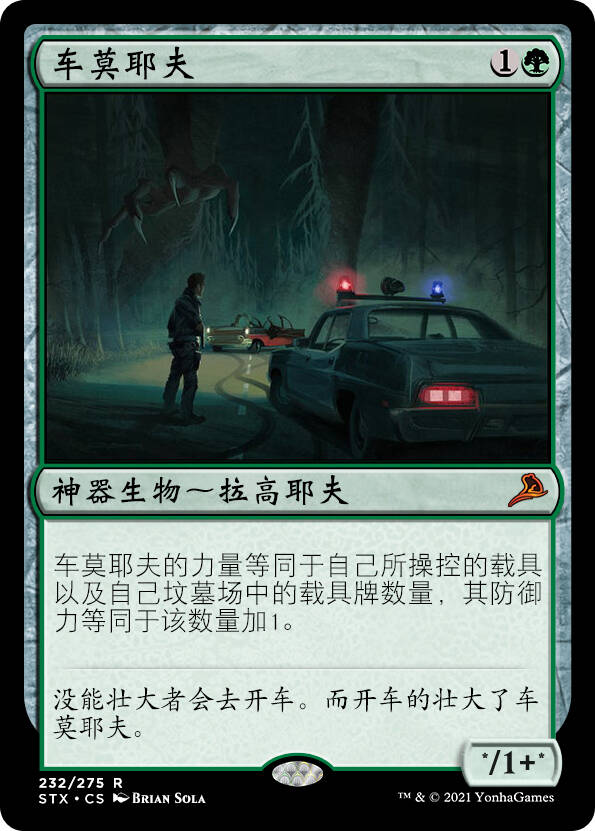 注:介于这张牌是「塔莫耶夫」的neta,我稍微把异能改了一下(原版的是自己场上坟场每有一个载具车莫耶夫便得+1/+1,这两种写法的区别在于原版写法在战场上以外的其他地方都是0/1)。