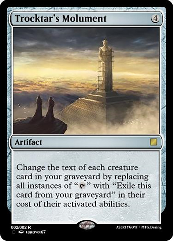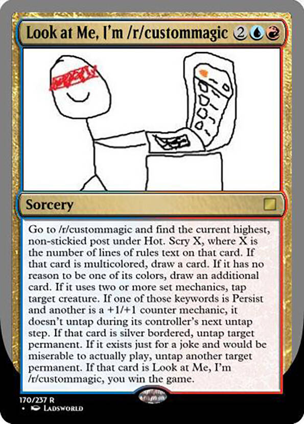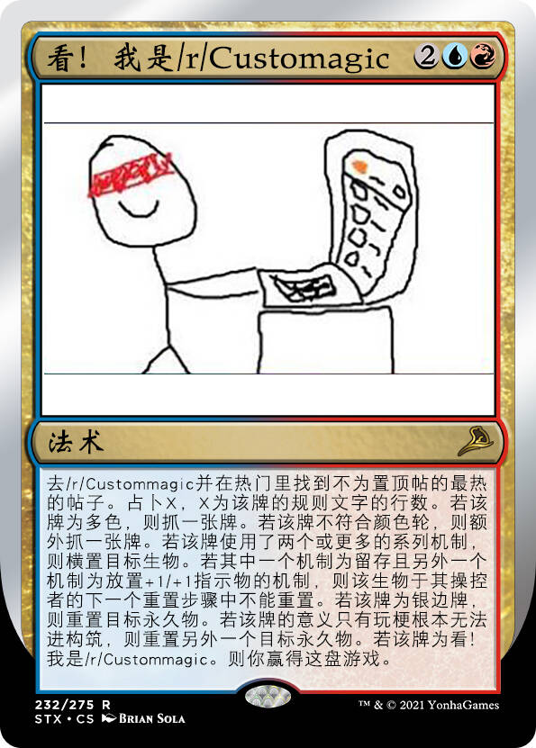 r/Custommagic是欧美MTG社区里最大的MTG DIY卡聚集地,有超过2.9万人关注。从2016年8月初开始,用户Sonserf369就在r/magicTCG(Reddit上最大的MTG社区)搬运r/Custommagic的周度高赞新卡前5(那时候他是帮人发帖,之后又过了小半年左右那个人删号了,他就正式接手了)。我也是因为他的帖子才接触r/Custommagic这个MTG DIY社区的。在征得他的搬运同意许可之后,为了防止过度发帖(并且这样也好赶上进度)。他发的周度帖子将会被我合并成为一个月度帖子并在这里发布。我搬运这些DIY卡的第一个目的是为了让大家看看老外的脑洞和创意有多大,第二个目的则是为了给大家宣传r/Custommagic。