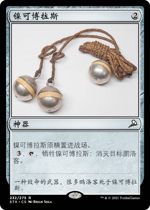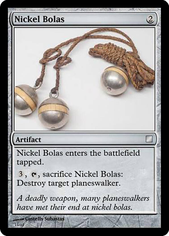 注:这牌玩的是谐音梗。Nickel和Nicol读音相近,而Bolas是流星锤的意思,也有叫音译博拉斯的。