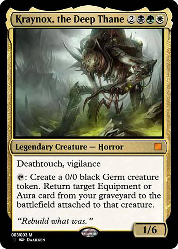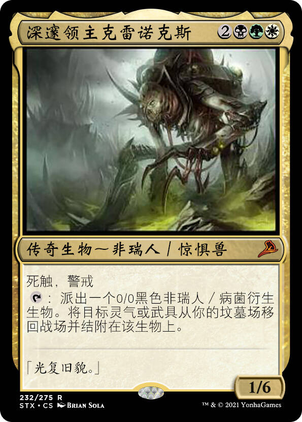 注:克雷诺克斯是新非瑞的七位钢铁领主中的一位,它出场于新非瑞克西亚旅法师指南系列,博识都有翻译。(其实就是大家都在地表和秘罗地人玩♂游♂戏的时候他躲在地下玩我的世界)介于卫生纸为了控制二手市场炒热性病人价格搞了一波非瑞人种族来给新非回归预热,我给这张牌加上了非瑞人。
