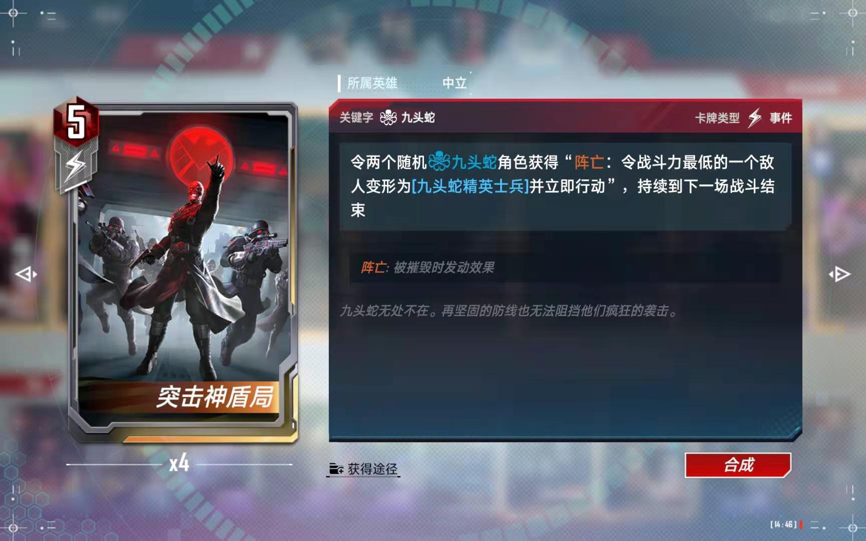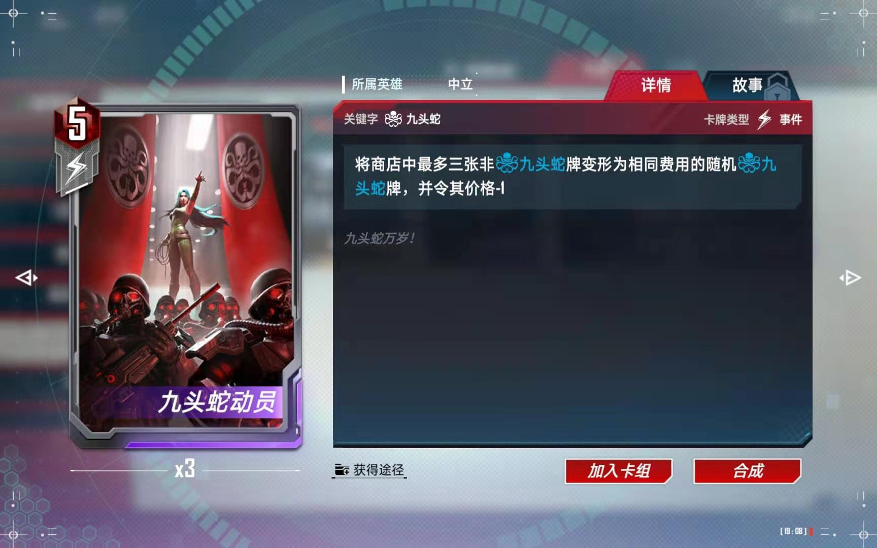 (2)使用九头蛇动员以前,必须先把商店非五费的卡牌买下来卖掉,只留五费卡牌,这样找到突击神盾局的概率会**提高,也不会亏多少钱,因为九头蛇动员刷新的“突击神盾局”要便宜。
