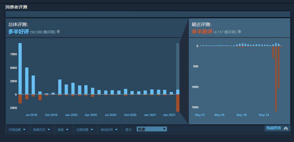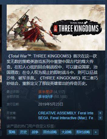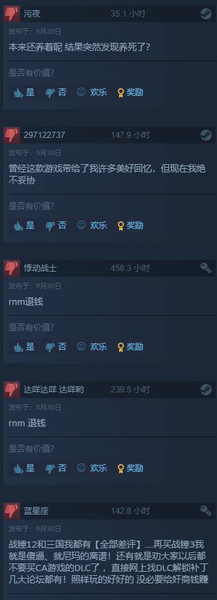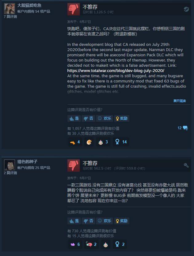 由CA工作室开发,世嘉发行的《全面战争》系列游戏《三国:全面战争》近日宣布本作所有内容已经制作完成,并将停止后续内容更新,这条消息引起大量玩家不满,愤怒的玩家纷纷前往Steam页面为本作给出差评,其中不乏有游玩上千小时的“肝帝”参与,从5月27日消息公布当天至今,共有3000余条差评,本作的最近好评率也已经跌至22%(多半差评)。
