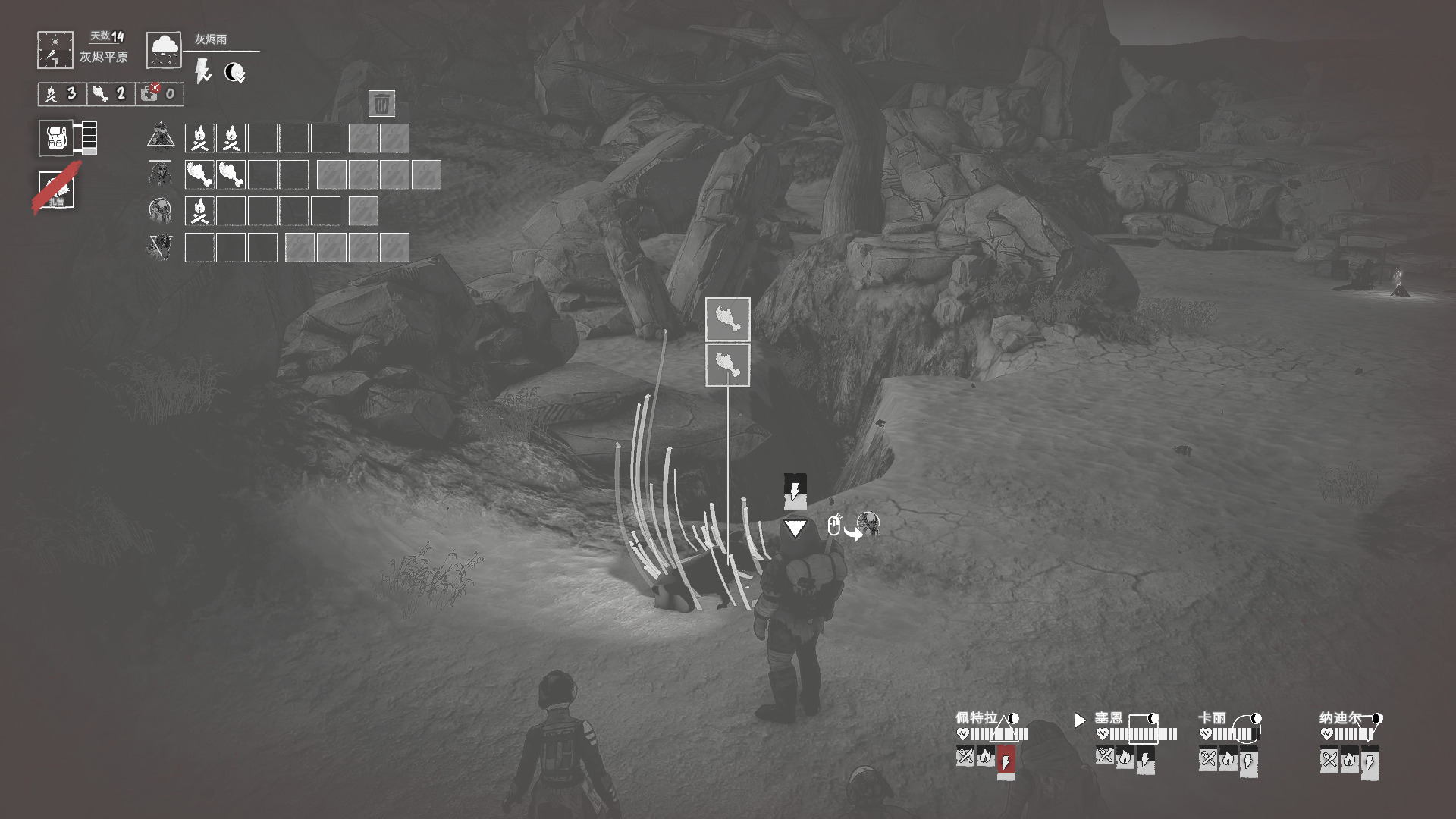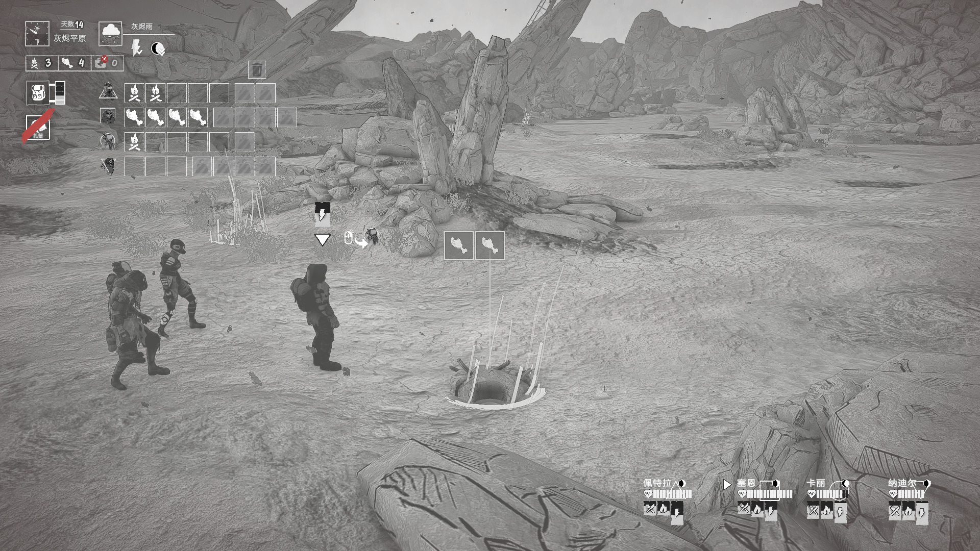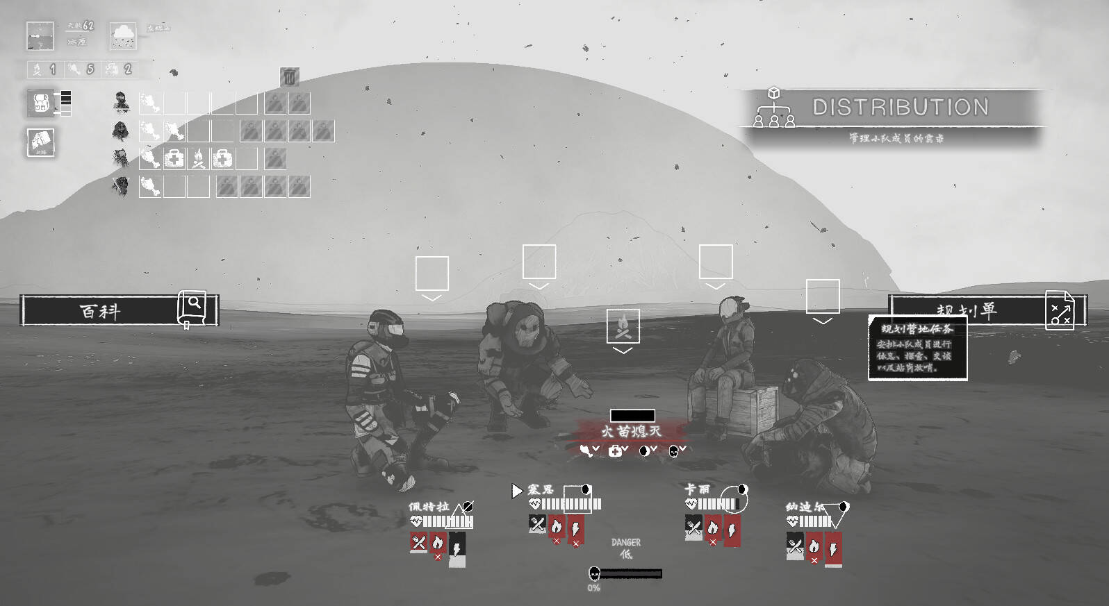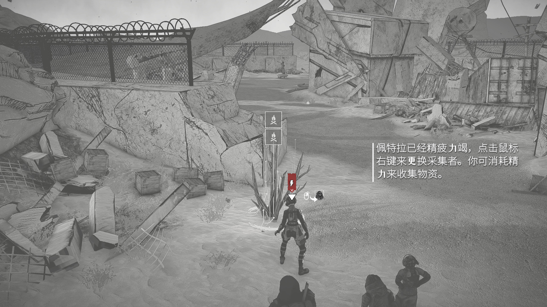 在路途中我们能遇到各种物资需要采集,这时候我们要及时选择人物来采集物资。虽然说教程让我们学习如何换人,但是你能告诉我为什么这个女的啥也没干就精疲力尽了?大家都走了一样的路就因为她是领头所以她体力用完了?