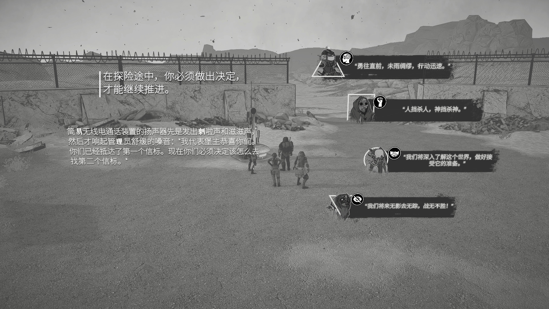 本作开头剧情采用PPT播片的方式,无法跳过无法快进,信息量也很有限,就是单纯的“角一行人为了拯救25万人的生命踏上征程,跟随着信标的线索去寻找新的庇护所。 ”