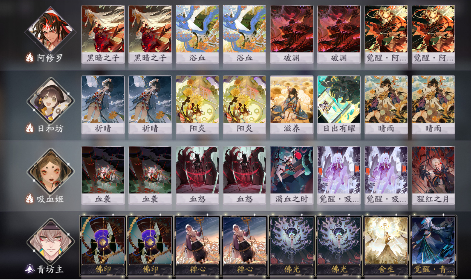 阵容名: 阿修罗 黑暗之子 (2) 浴血 (2) 破渊 (2) 觉醒·阿修罗 (2) 日和坊 晴雨 (2) 阳炎 (2) 祈晴 (2) 滋养 (1) 日出有曜 (1) 吸血姬 渴血之时 (1) 觉醒·吸血姬 (2) 猩红之月 (1) 血袭 (2) 血怒 (2) 青坊主 觉醒·青坊主 (1) 舍生 (1) 佛印 (2) 禅心 (2) 佛光 (2) 阵容码:Ml8xMDFfNDg3NjUxNV8xNjIyNDUyNjc3fHp4AAACAAAABl4BAA5eAQAWXgEAHl4BAGUOAQBuDgEAcQ4BAFYOAQBeDgEAggMBAGoDAQBuAwEAdQMBAHkDAQBpwwAAbcMAAFbDAABawwAAXsMAAA== 如果想要使用此阵容,可将阵容码复制到剪贴板,然后在“新建阵容”里点击“使用阵容码”进行粘贴。