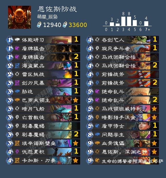 来自营地用户萌星_辰枭投稿的一套恩佐斯防战,他用这套卡组从传说4300名打到2700名。这套卡组的最大优势在于得益于天梯上防战和突袭战交相掩护,能够依靠信息差打对手一个措手不及。不过由于并不是完全的防战,叠甲能力还是有所欠缺,所以前期需要好好运营自身血量。卡组的整体思路是防守反击,前期依靠低费的优质解牌和质量随从完成解场避免被斩杀,后期问题学生、血骨傀儡、生命的缚誓者阿来克丝塔萨以及恩佐斯,深渊之神都是很好的质量单卡,足以终结大部分快攻和中速卡组。另外值得一提的是,面对吸血瞎时可以依靠埃辛诺斯壁垒和源源不断的嘲讽随从赢得对局。总的来说,这套卡组除了面对德鲁伊和恶魔猎手有一点小劣,打大部分卡组都有一战之力,推荐给大家尝试。