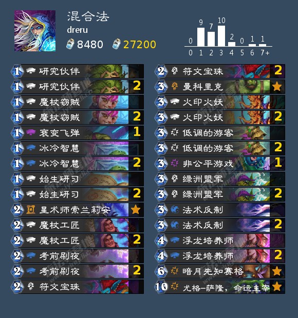 来自营地老哥dreru研发的一套混合法,他使用这套卡组以65%+的胜率打上传说。由于构筑比较奇特,因此dreru也是对这套构筑进行了十分详尽的介绍。以下介绍主要来自他自己: