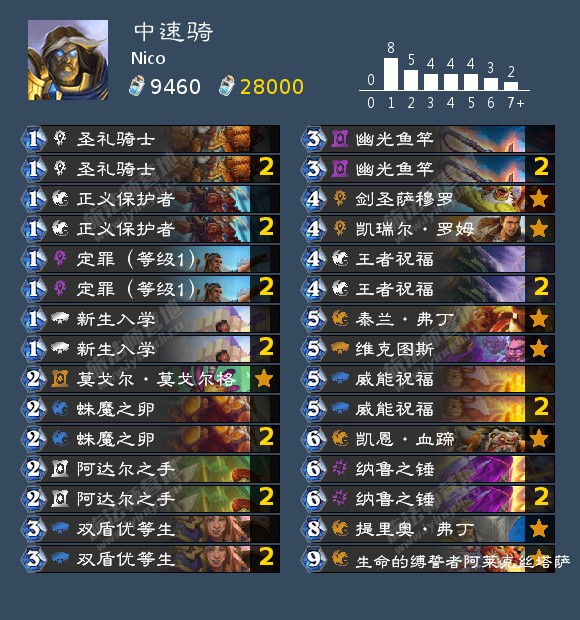 这套卡组的构筑基本沿用了补丁前中速骑的框架,核心思路依旧是前期滚场面,并通过王者祝福、威能祝福等buff来提供中期的压制力。不过由于螃蟹骑士以及新生入学的削弱,中速骑的前期压制力大幅减弱,因此这套卡组加入了提里奥·弗丁。弗丁本体是一个66圣盾墙,有着不俗的压制力和站场能力,亡语效果也可以让我们高效控场或者是快速压低对手血线,可以拉扯出很铺场空间,甚至起到一锤定音的效果。