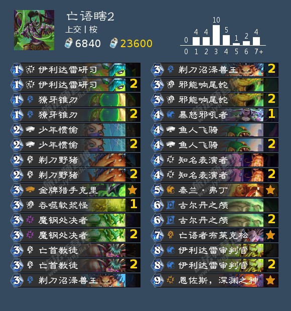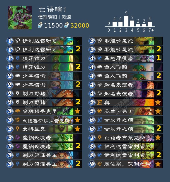 亡语瞎打控制牧、防战很难输,依靠888及恩佐斯复活的888能提供巨大压力(对局中需注意有些回合要留刀,保证888下场就能踢脸)。亡语瞎的最大劣势对局是萨满和猎人,因此我这套带满了324亡语回血,**提高了胜率。
