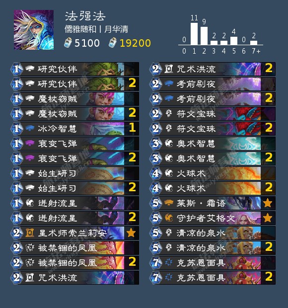 来自营地用户儒雅随和丨月华清的投稿,他用这套卡组打上了传说。与常规的法术法相比,虽然这套卡组因为携带了几张随从牌而导致清凉的泉水不能稳定触发,但是这套卡组无论是被禁锢的凤凰还是守护者艾格文都能给我们提供更高的斩杀线。卡组的整体思路相比法术法而言也更加清晰,前期找咒术洪流给法术减费,后期攒直伤法术和法强加成来斩杀对方。有一个小技巧是如果起手被禁锢的凤凰和咒术洪流同时在手上,二费先打咒术洪流接三费被禁锢的凤凰,从而做到五费被禁锢的凤凰醒了和莱斯·霜语配合打出节奏或者考前刷夜过一波牌。按照儒雅随和丨月华清的话来说,这套卡组面对面对快攻是劣势对局以外都还可以,思路清晰也比较容易使用,推荐给大家尝试。