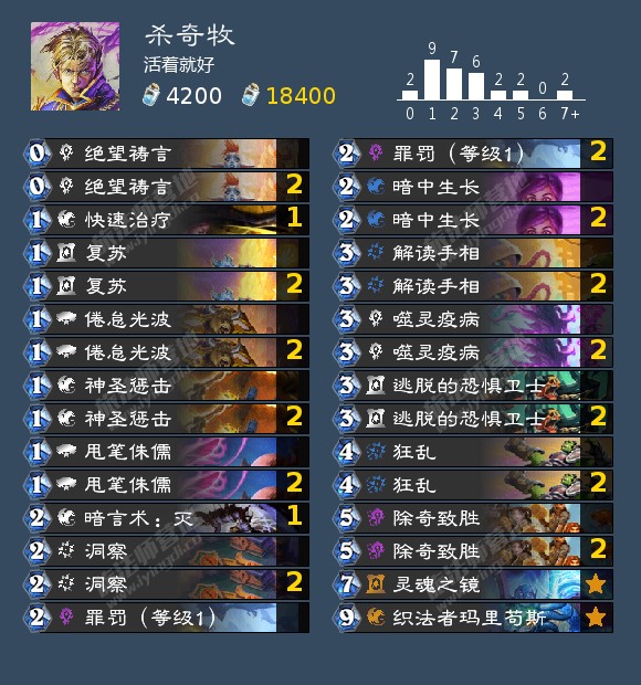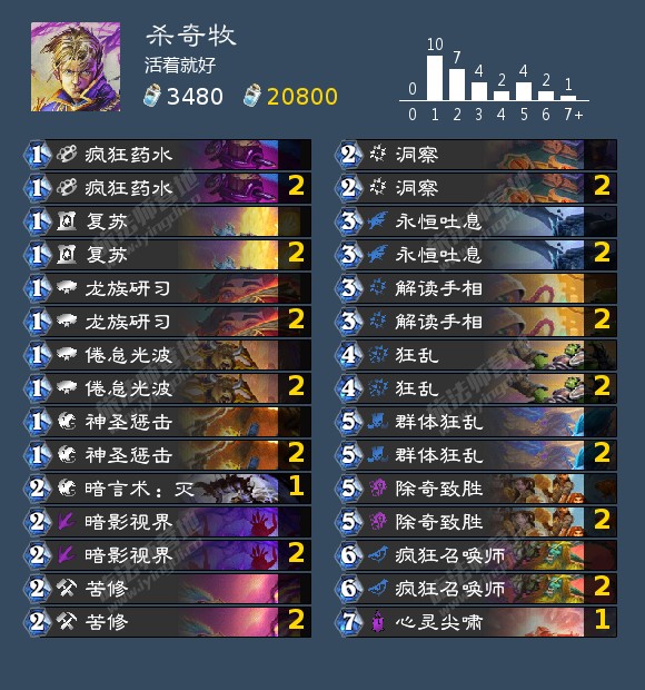 标准卡组没了疯狂召唤师就只能用逃脱的恐惧卫士了。1卡就可以算4个,2卡就8个了,再加2个甩笔正好10个。因为牧师过牌实在太捉急了,所以还带上了蓝龙过牌。标准要用这个卡组就很麻烦了,基本上要过空牌库才行。所以如果能狂野做还是狂野做好。
